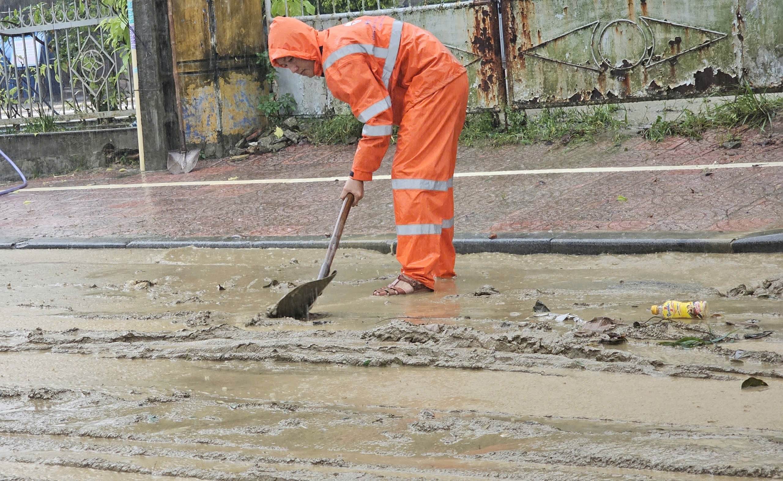 | ផ្នែកមួយនៃផ្លូវ Phan Dinh Phung ដែលគ្របដណ្ដប់ដោយភក់ក្រាស់ត្រូវបានសម្អាតនៅពេលថ្ងៃត្រង់ថ្ងៃទី 30 ខែតុលា។ |