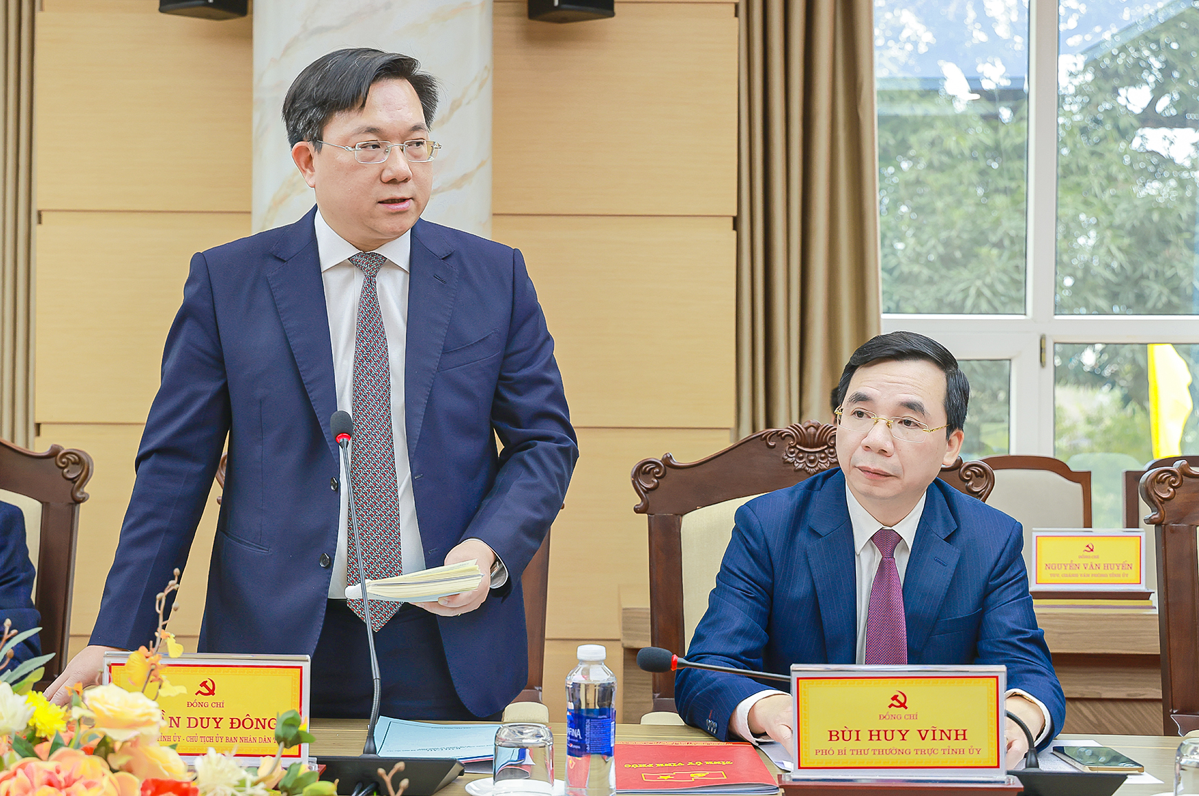 អនុលេខាគណៈកម្មាធិការបក្សខេត្ត Bui Huy Vinh ថ្លែងមតិក្នុងសន្និសីទ។ រូបថត៖ Tra Huong