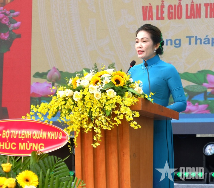 | លោកស្រី ង្វៀន ធី អៀន ត្រាង នាយិកាមន្ទីរវប្បធម៌ កីឡា និងទេសចរណ៍ខេត្តដុងថាប បានថ្លែងសុន្ទរកថានៅក្នុងពិធីនេះ។ |