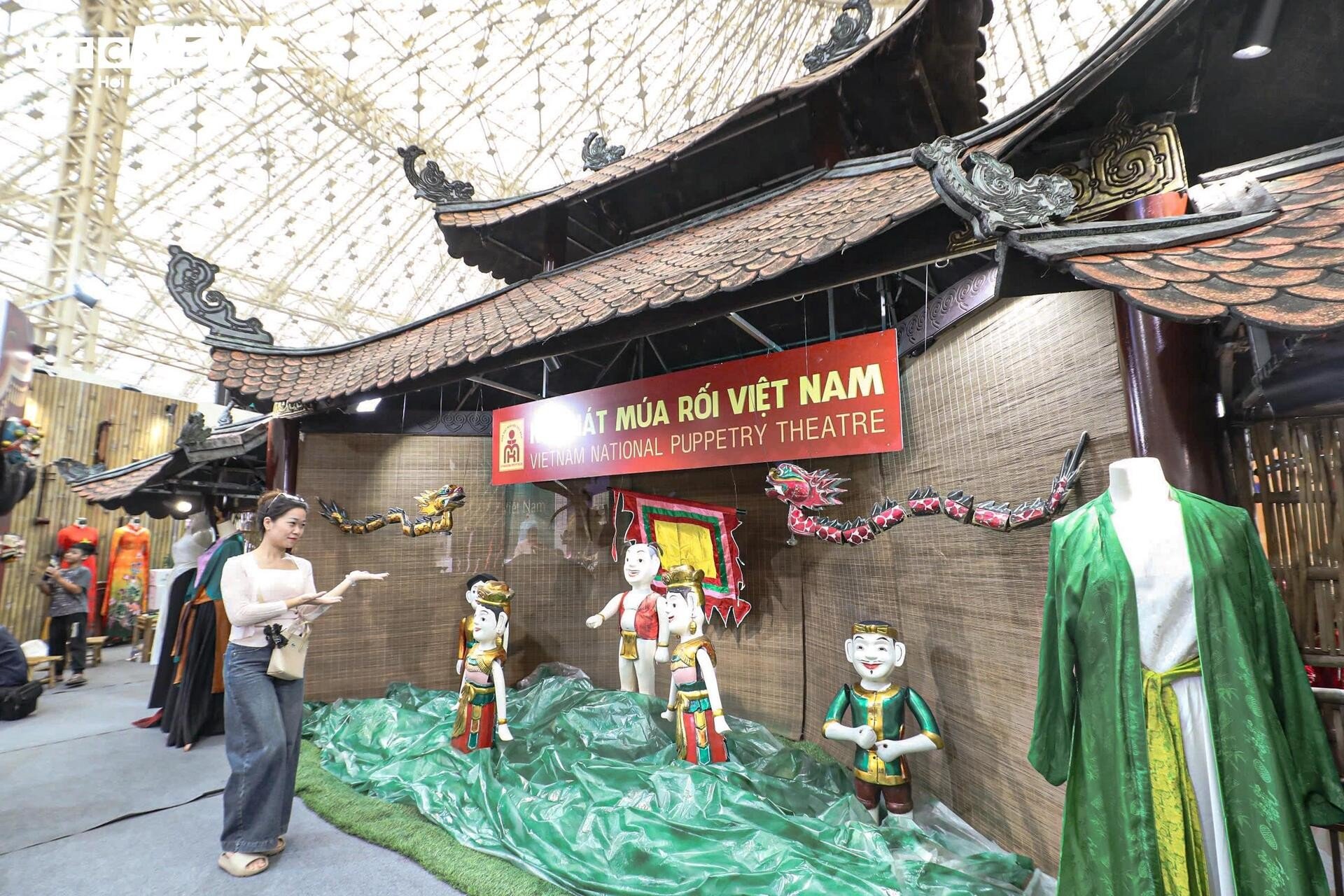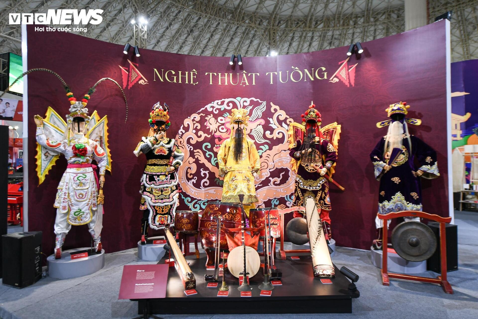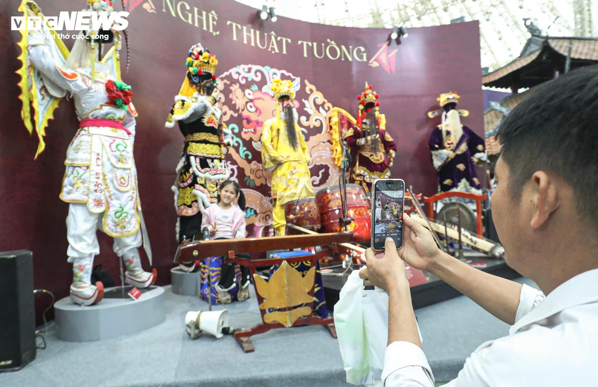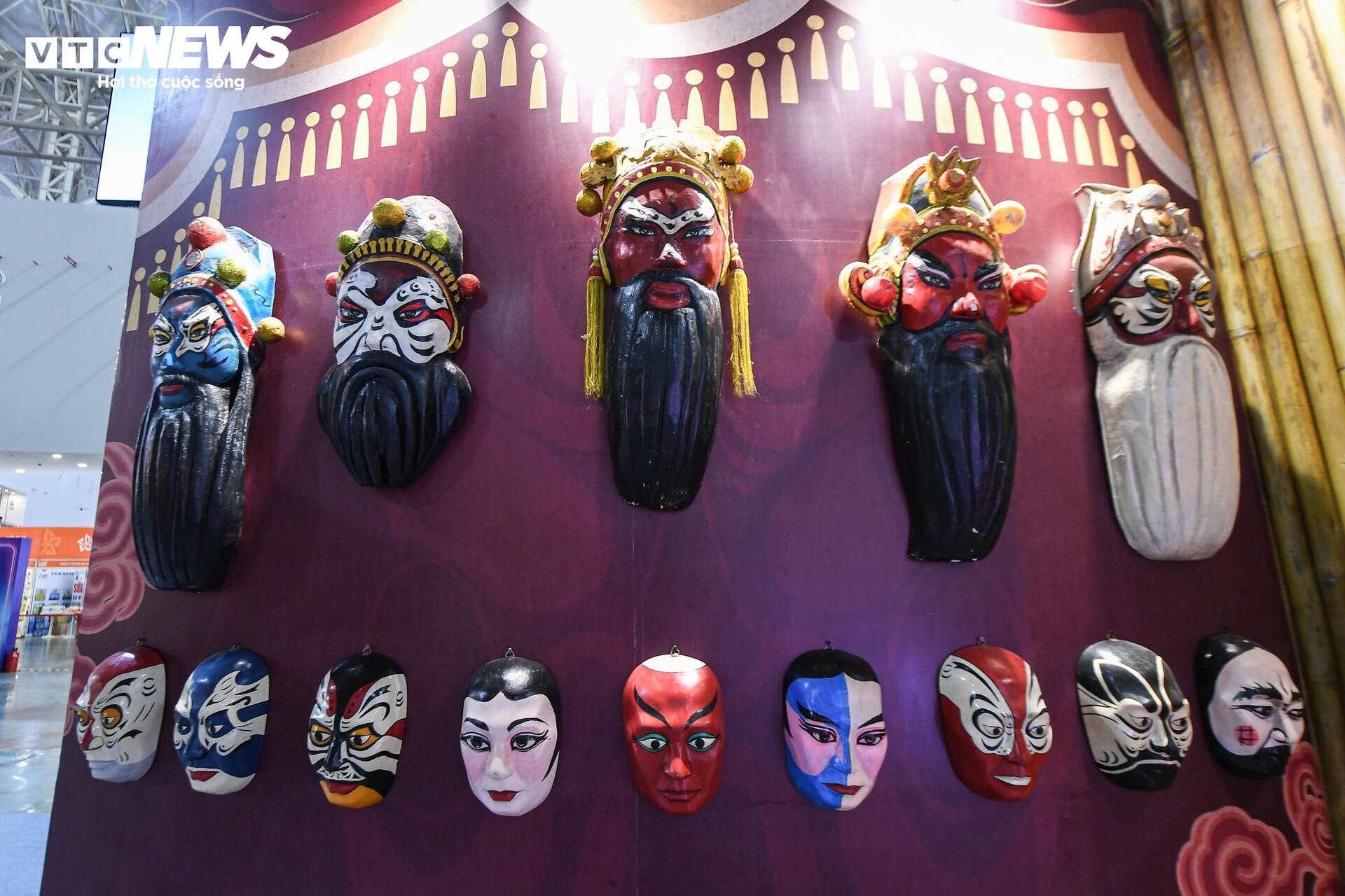នៅមិនឆ្ងាយប៉ុន្មាន ស្តង់តាំងពិពណ៌របស់រោងមហោស្រពវៀតណាម Tuong ទាក់ទាញអ្នកទស្សនាដោយពណ៌រស់រវើក និងសំឡេងប្លែកៗ។ សំឡេងស្គរ ទះដៃ និងសំឡេងទោល លាយឡំនឹងក្លិនម្រ័ក្សណ៍ក្រហមនៅលើរបាំងមុខ ធ្វើឱ្យយុវជនជាច្រើនឈប់រៀនបន្ថែម។