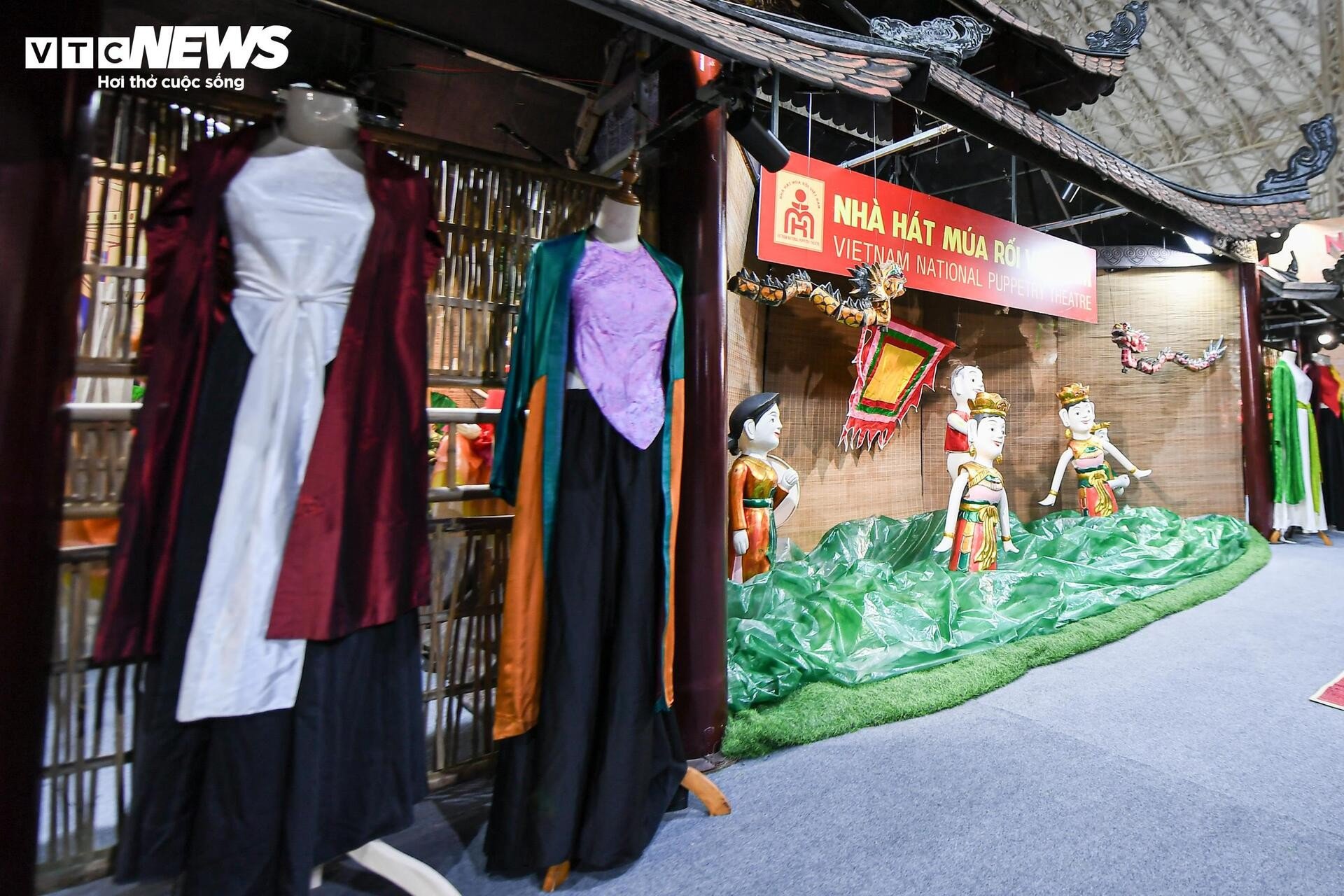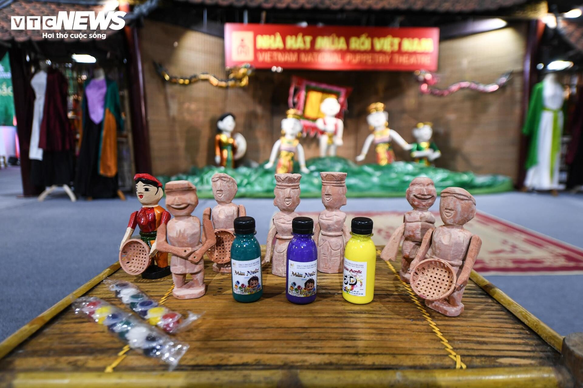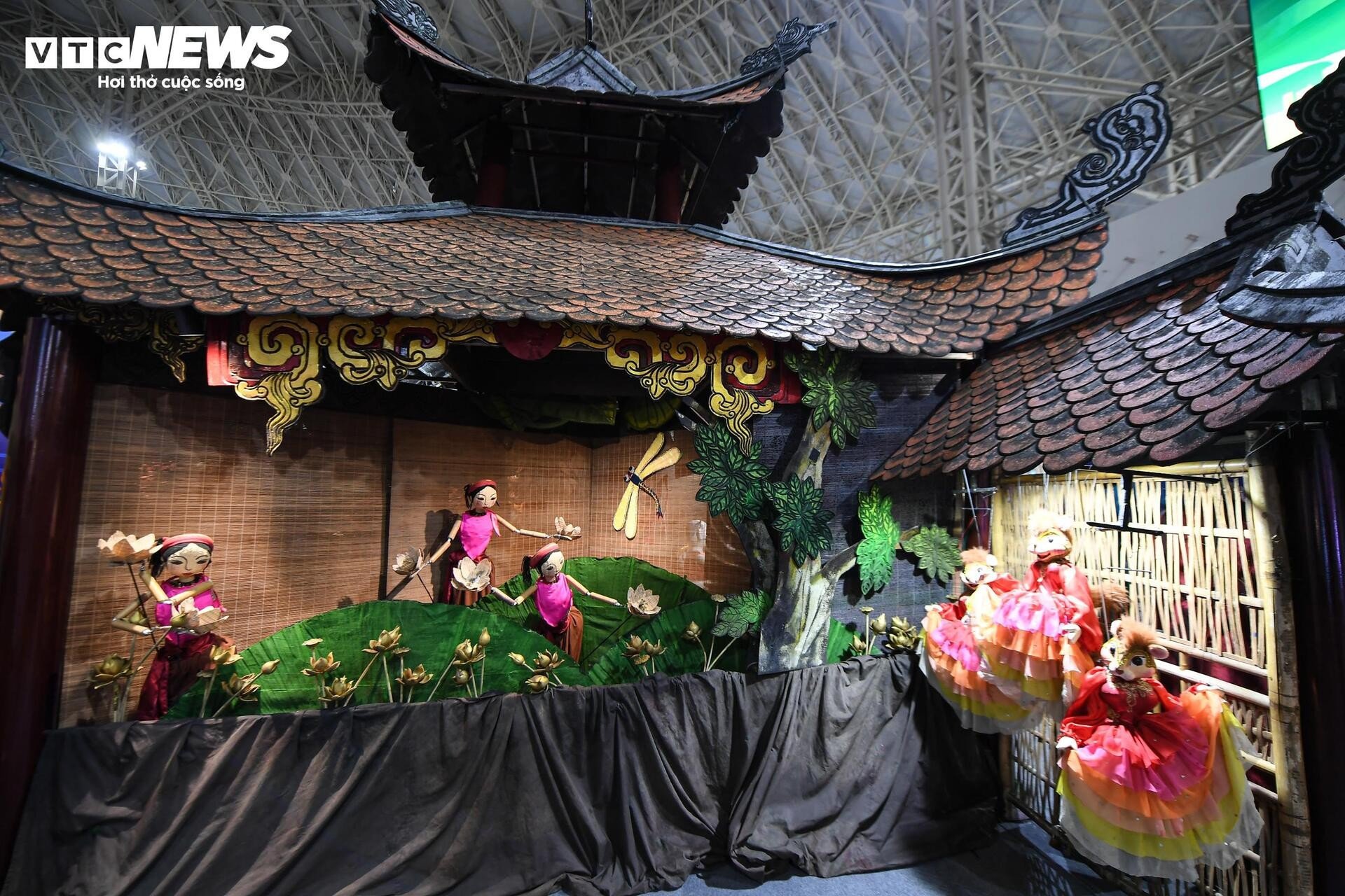 នៅមិនឆ្ងាយប៉ុន្មាន ស្តង់តាំងពិពណ៌របស់រោងមហោស្រពវៀតណាម Tuong ទាក់ទាញអ្នកទស្សនាដោយពណ៌រស់រវើក និងសំឡេងប្លែកៗ។ សំឡេងស្គរ ទះដៃ និងសំឡេងទោល លាយឡំនឹងក្លិនម្រ័ក្សណ៍ក្រហមនៅលើរបាំងមុខ ធ្វើឱ្យយុវជនជាច្រើនឈប់រៀនបន្ថែម។