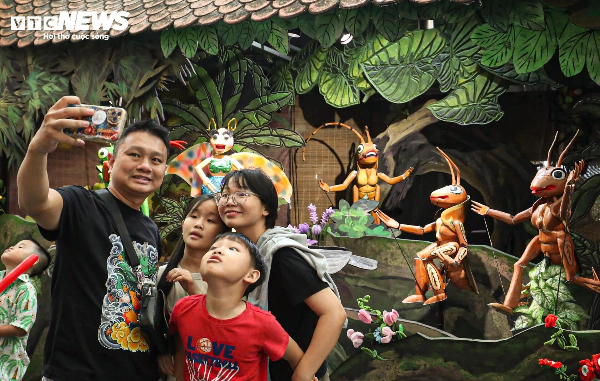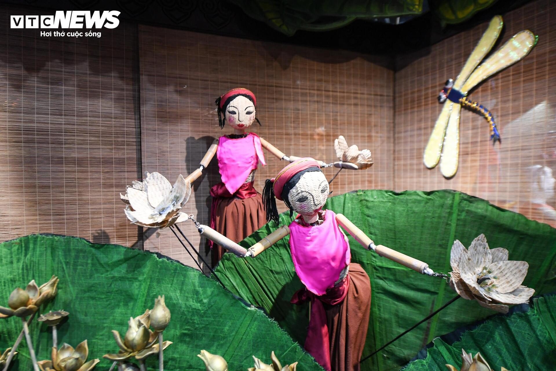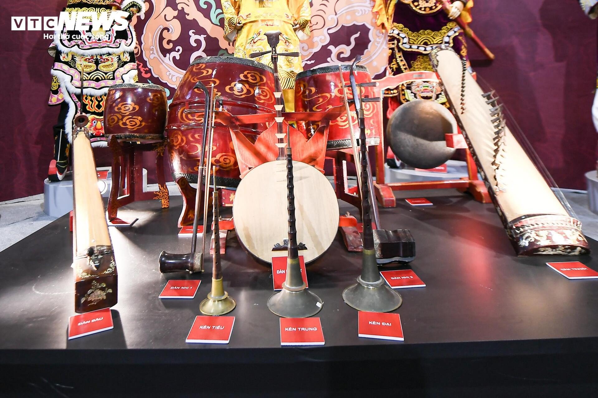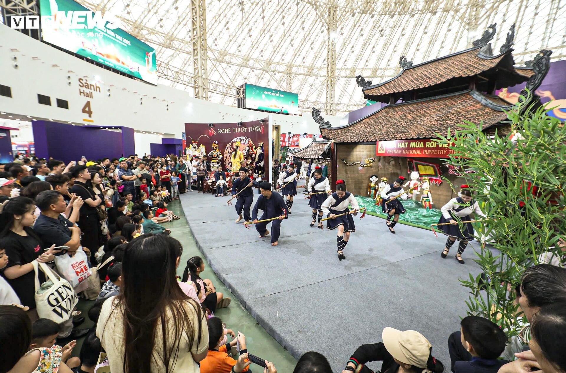 នៅមិនឆ្ងាយប៉ុន្មាន ស្តង់តាំងពិពណ៌របស់រោងមហោស្រពវៀតណាម Tuong ទាក់ទាញអ្នកទស្សនាដោយពណ៌រស់រវើក និងសំឡេងប្លែកៗ។ សំឡេងស្គរ ទះដៃ និងសំឡេងទោល លាយឡំនឹងក្លិនម្រ័ក្សណ៍ក្រហមនៅលើរបាំងមុខ ធ្វើឱ្យយុវជនជាច្រើនឈប់រៀនបន្ថែម។