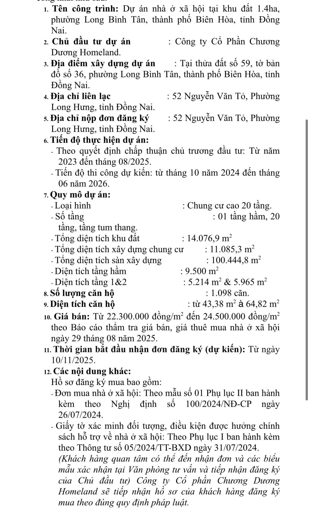 គម្រោងនេះមានអាផាតមិនដែលមានផ្ទៃដីពី 43-65m² ដែលមានតម្លៃប៉ាន់ស្មានប្រហែល 22.3-24.5 លានដុង/m²។ ពេលវេលាដើម្បីទទួលបានឯកសារចុះឈ្មោះដើម្បីទិញ ត្រូវបានគេរំពឹងថានឹងចាប់ផ្តើមនៅក្នុងខែតុលា ឆ្នាំ 2025។ ឯកសាររួមមានៈ ទម្រង់ពាក្យស្នើសុំទិញលំនៅដ្ឋានសង្គម ឯកសារបញ្ជាក់ពីមុខវិជ្ជា និងលក្ខខណ្ឌសម្រាប់ការរីករាយនឹងគោលនយោបាយ។ ប្រជាជន​ដាក់​ពាក្យ​ស្នើសុំ​ដោយ​ផ្ទាល់​នៅ​ផ្ទះ​គំរូ​ការិយាល័យ​លក់​របស់​គម្រោង (52 Nguyen Van To, Long Binh Quarter, Long Hung Ward, ខេត្ត Dong Nai)។