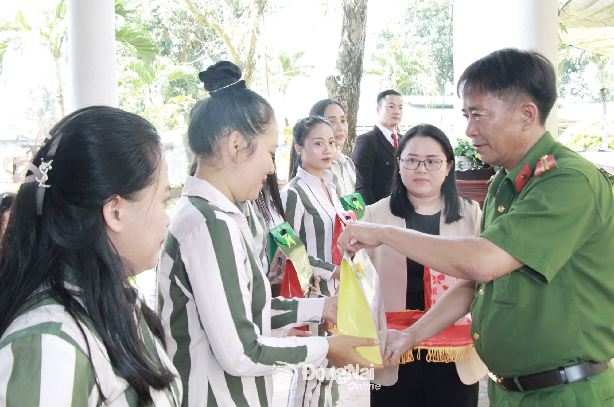 លោកវរសេនីយ៍ឯក Nguyen Dinh Hai អនុប្រធានពន្ធនាគារ Xuan Loc ប្រគល់អំណោយដល់ទណ្ឌិតជាស្ត្រីដែលឈ្នះរង្វាន់លើកទឹកចិត្តក្នុងការប្រកួតសរសេរអំពីស្ត្រីដែលខ្ញុំស្រឡាញ់។ រូបថត៖ Nga Son |