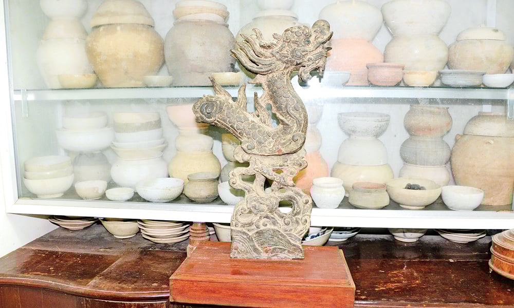 លោកឌុង បានប្រមូល និងថែរក្សាក្បាលនាគមួយដុំដែលមានអាយុកាលតាំងពីចុងរាជវង្សលី ឬដើមរាជវង្សថ្រិន។ |