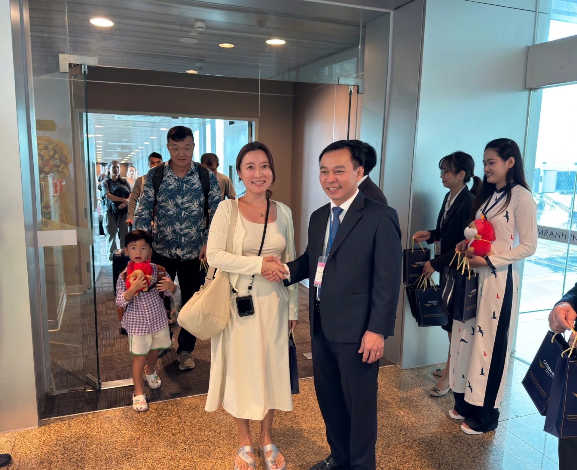 | ថ្នាក់ដឹកនាំនៃមជ្ឈមណ្ឌលវិនិយោគ ពាណិជ្ជកម្ម និង ទេសចរណ៍ Khanh Hoa ស្វាគមន៍ភ្ញៀវទេសចរដែលហោះហើរពីសិង្ហបុរី។ |