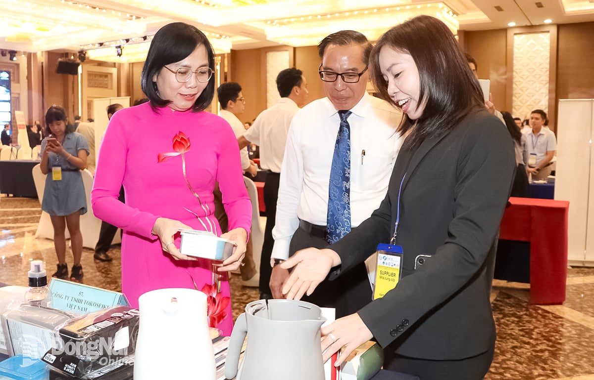 | សមាជិកគណៈកម្មាធិការបក្សខេត្ត អនុប្រធានគណៈកម្មាធិការប្រជាជនខេត្ត Dong Nai លោកស្រី Nguyen Thi Hoang បានទៅទស្សនាស្តង់សហគ្រាសក្នុងស្រុកក្នុងសន្និសីទពាណិជ្ជកម្ម។ រូបថត៖ ង៉ុក លៀន |