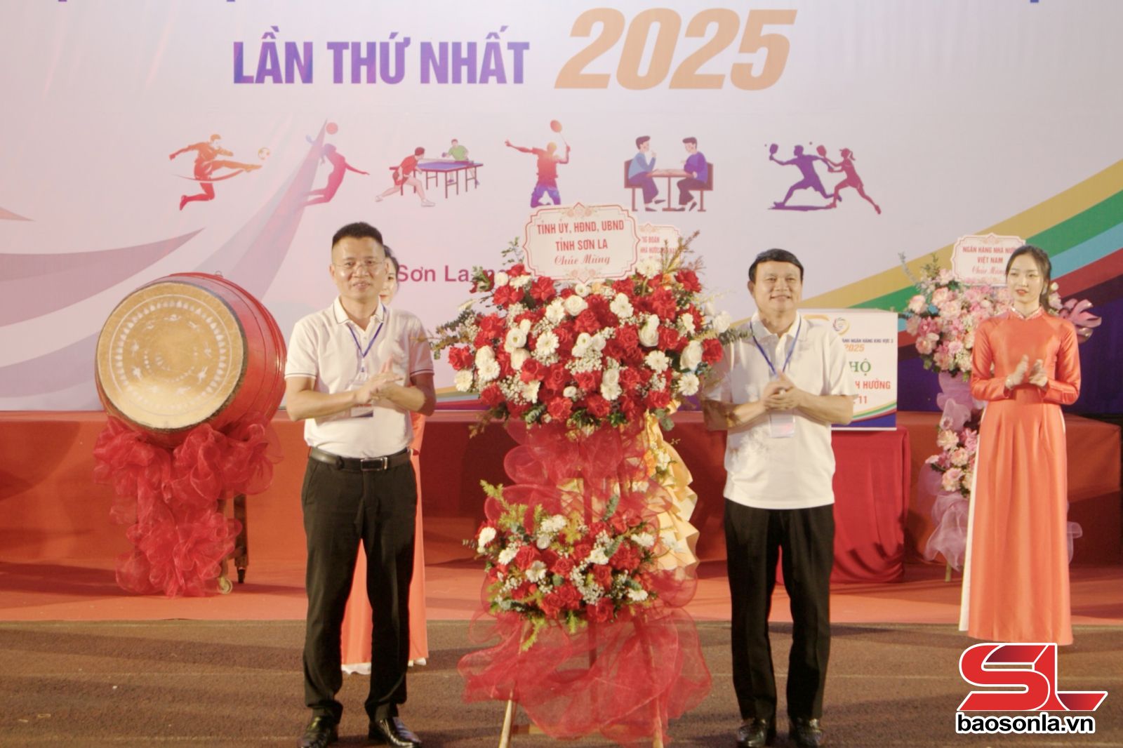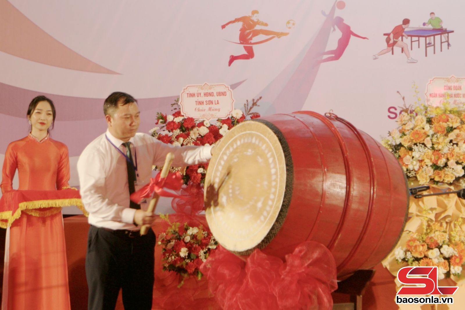 នាយកធនាគារវិនិយោគ និងអភិវឌ្ឍន៍សាខាខេត្ត Son La ប្រធានគណៈកម្មាធិការរៀបចំសមាជ - តំណាងអង្គភាពម្ចាស់ផ្ទះវាយស្គរបើកពិធីបុណ្យ។