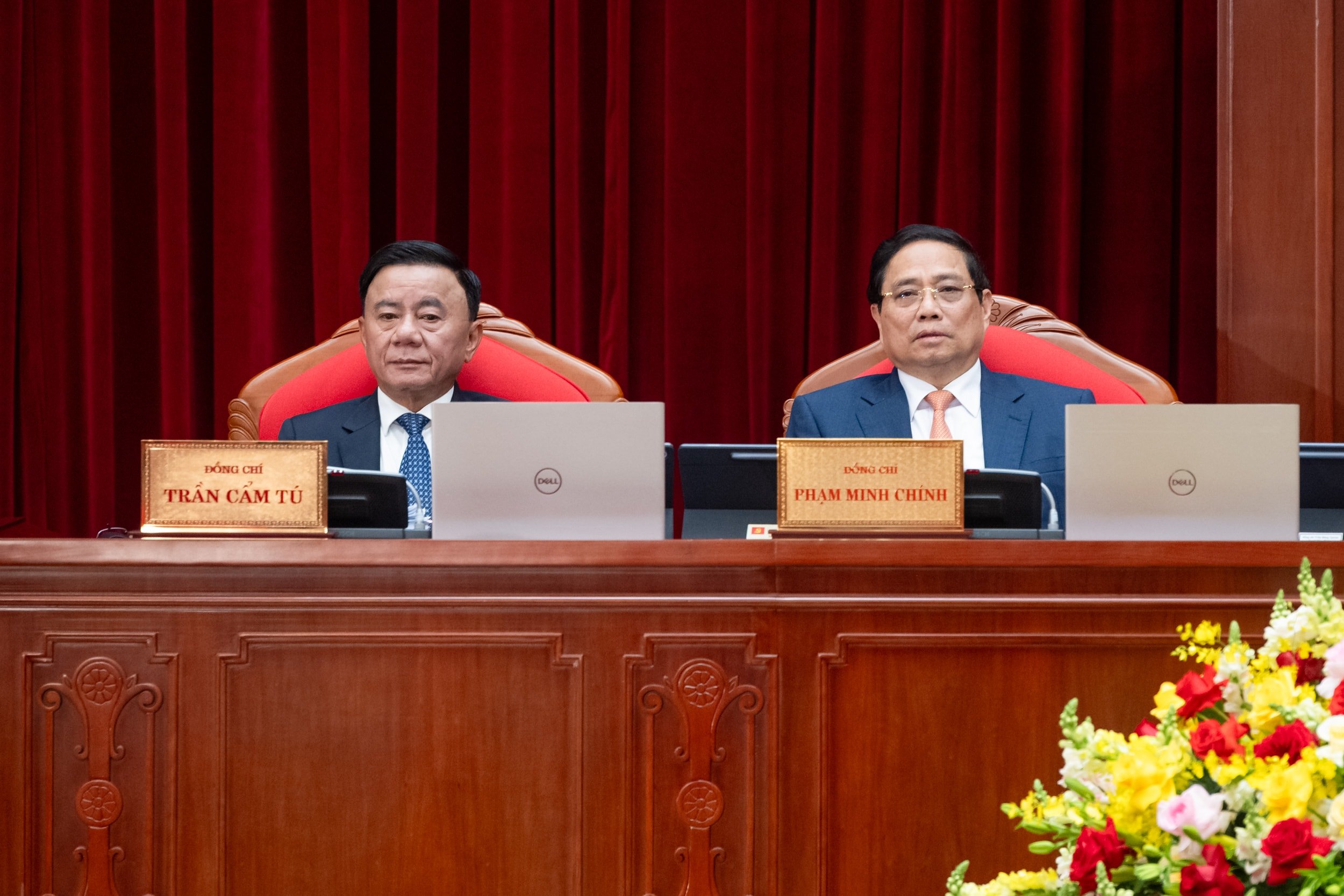 នាយករដ្ឋមន្ត្រី Pham Minh Chinh និងលេខាអចិន្ត្រៃយ៍នៃលេខាធិការដ្ឋាន Tran Cam Tu ក្នុងសន្និសីទ