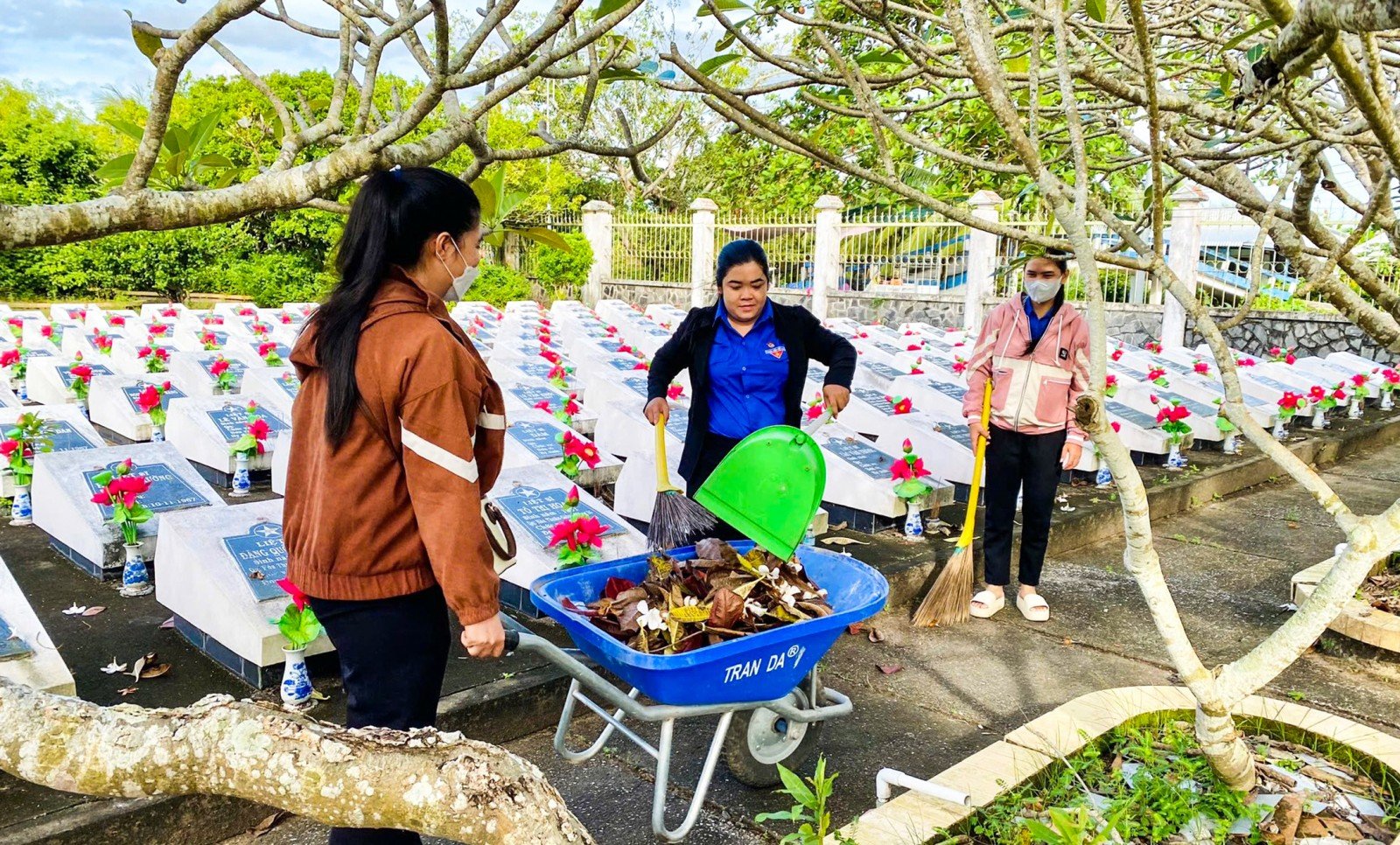 សមាជិកសហភាពយុវជន និងយុវជនឃុំសម្អាតនៅទីបញ្ចុះសព Cay Bang។ រូបថត៖ THUY TIEN