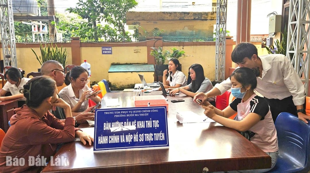 | បុគ្គលិកនៃមជ្ឈមណ្ឌលសេវាកម្មរដ្ឋបាលសាធារណៈសង្កាត់ Buon Ma Thuot ណែនាំប្រជាជនឱ្យប្រកាសអំពីនីតិវិធីរដ្ឋបាល និងបញ្ជូនឯកសារតាមអ៊ីនធឺណិត។ |