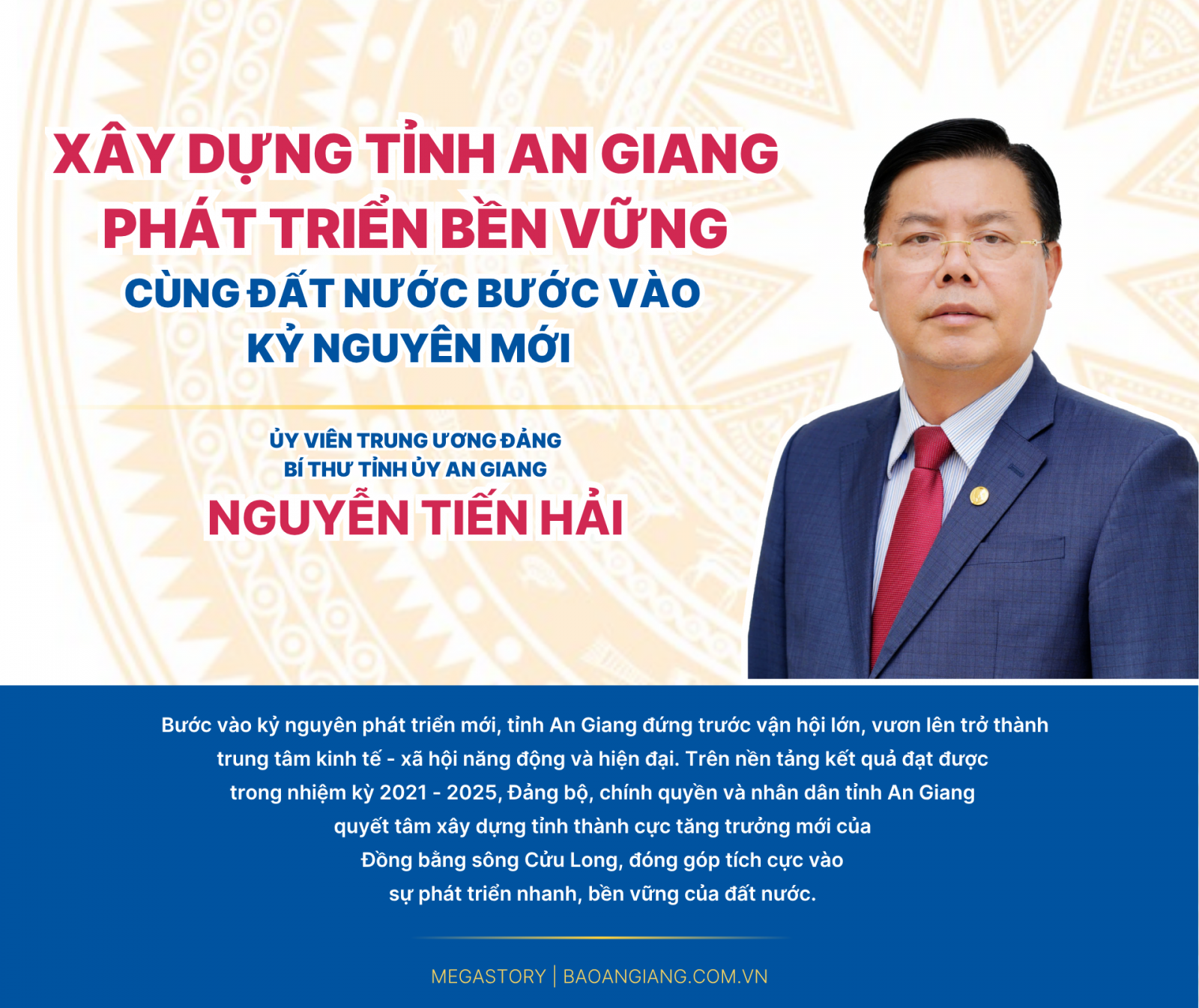 ឈានចូលយុគសម័យថ្មីនៃការអភិវឌ្ឍន៍ ខេត្ត An Giang កំពុងប្រឈមមុខនឹងកាលានុវត្តភាពដើម្បីក្លាយជាមជ្ឈមណ្ឌលសេដ្ឋកិច្ចសង្គមប្រកបដោយថាមពល និងទំនើប។ ផ្អែកលើលទ្ធផលដែលសម្រេចបានក្នុងអាណត្តិ ២០២១ - ២០២៥ គណៈកម្មាធិការបក្ស រដ្ឋាភិបាល និងប្រជាជនខេត្ត An Giang បានប្តេជ្ញាចិត្តកសាងខេត្តទៅជាបង្គោលកំណើនថ្មីនៃដីសណ្ដទន្លេមេគង្គ រួមចំណែកយ៉ាងសកម្មក្នុងការអភិវឌ្ឍន៍ប្រទេសយ៉ាងឆាប់រហ័ស និងប្រកបដោយចីរភាព។