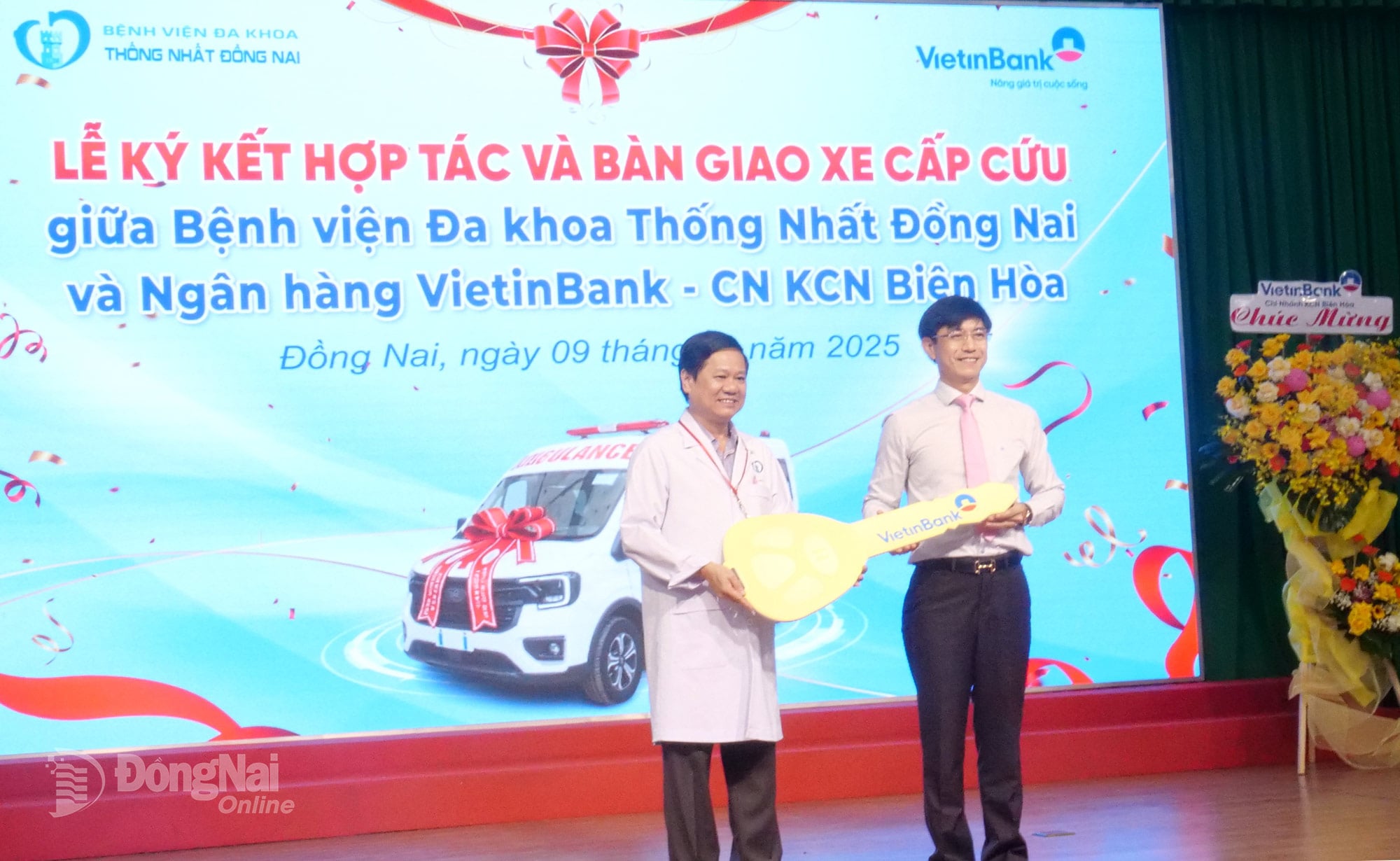 ថ្នាក់ដឹកនាំនៃសាខា Vietinbank Bien Hoa បានបង្ហាញនិមិត្តសញ្ញារថយន្តសង្គ្រោះបន្ទាន់ដល់ថ្នាក់ដឹកនាំនៃមន្ទីរពេទ្យទូទៅថុងញ៉ាត។ រូបថត៖ Hanh Dung |