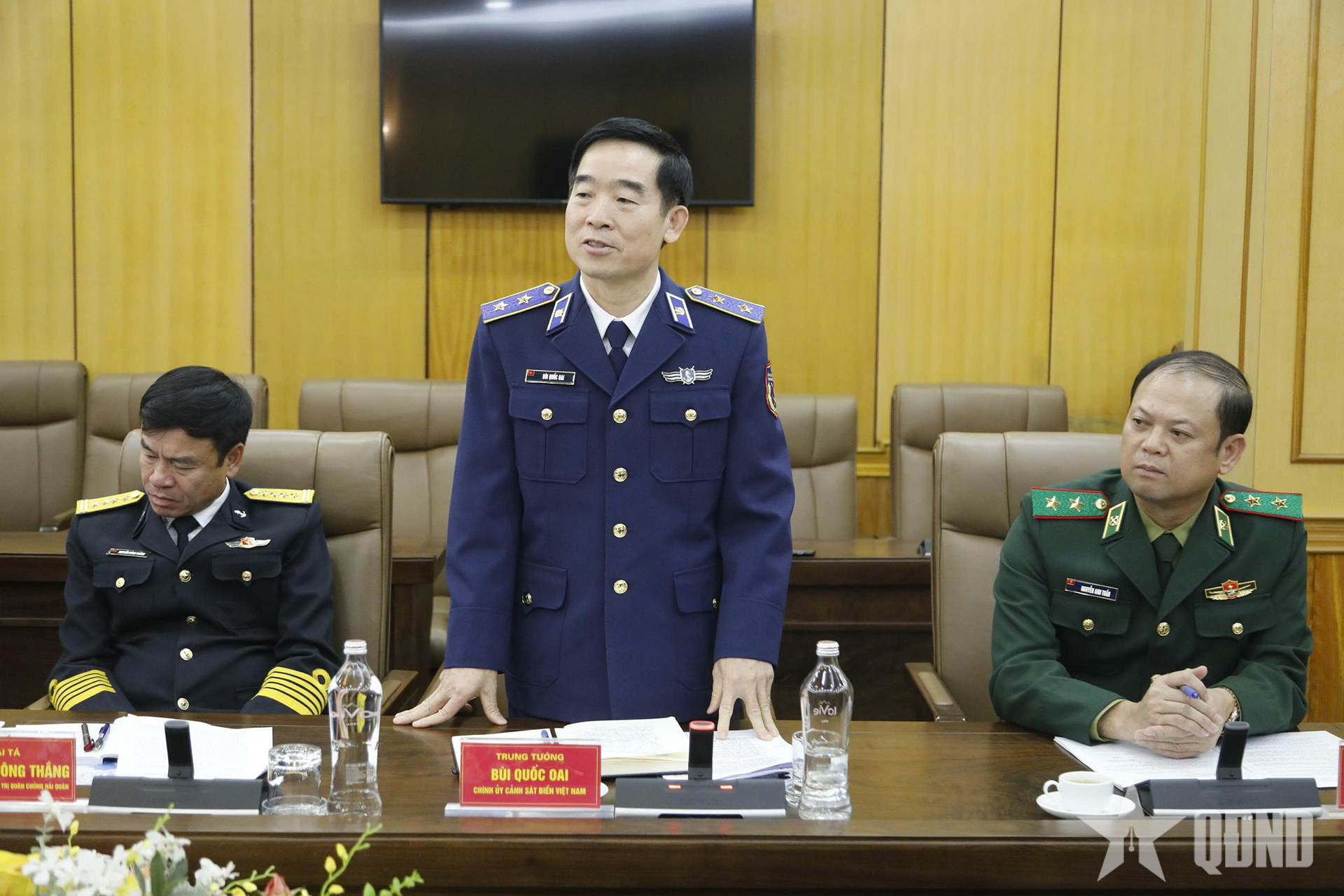 | លោកឧត្តមសេនីយ៍ឯក Bui Quoc Oai ស្នងការនយោបាយនៃឆ្មាំសមុទ្រវៀតណាម និងជាសមាជិកគណៈកម្មាធិការដឹកនាំមូលនិធិបានថ្លែងសុន្ទរកថានៅក្នុងសន្និសីទ។ |