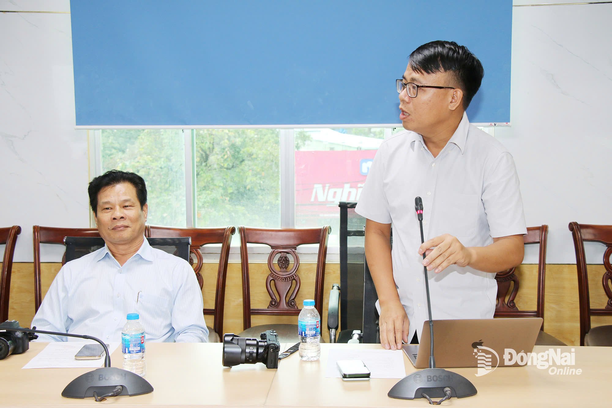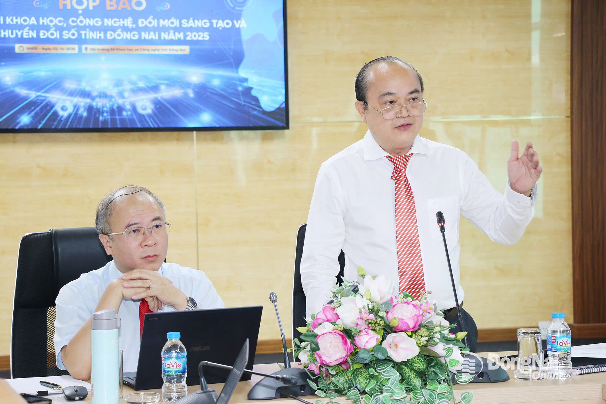 អនុប្រធានមន្ទីរ វិទ្យាសាស្ត្រ និងបច្ចេកវិទ្យាខេត្ត Dong Nai៖ លោក Vo Hoang Khai និងលោក Nguyen Minh Quang បានធ្វើជាអធិបតីក្នុងសន្និសីទកាសែត។ រូបថត៖ Hai Quan |