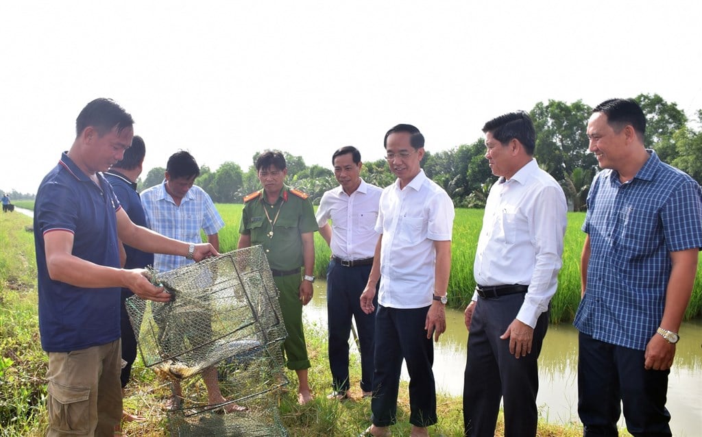 អនុលេខាគណៈកម្មាធិការបក្សខេត្ត Ho Thanh Thuy (ទី 3 ពីស្តាំ) បានចុះអង្កេតគំរូផលិតកម្មរួមនៃអង្ករ បង្គា ក្តាម ត្រី Goby នៅភូមិ Ong Muon ។