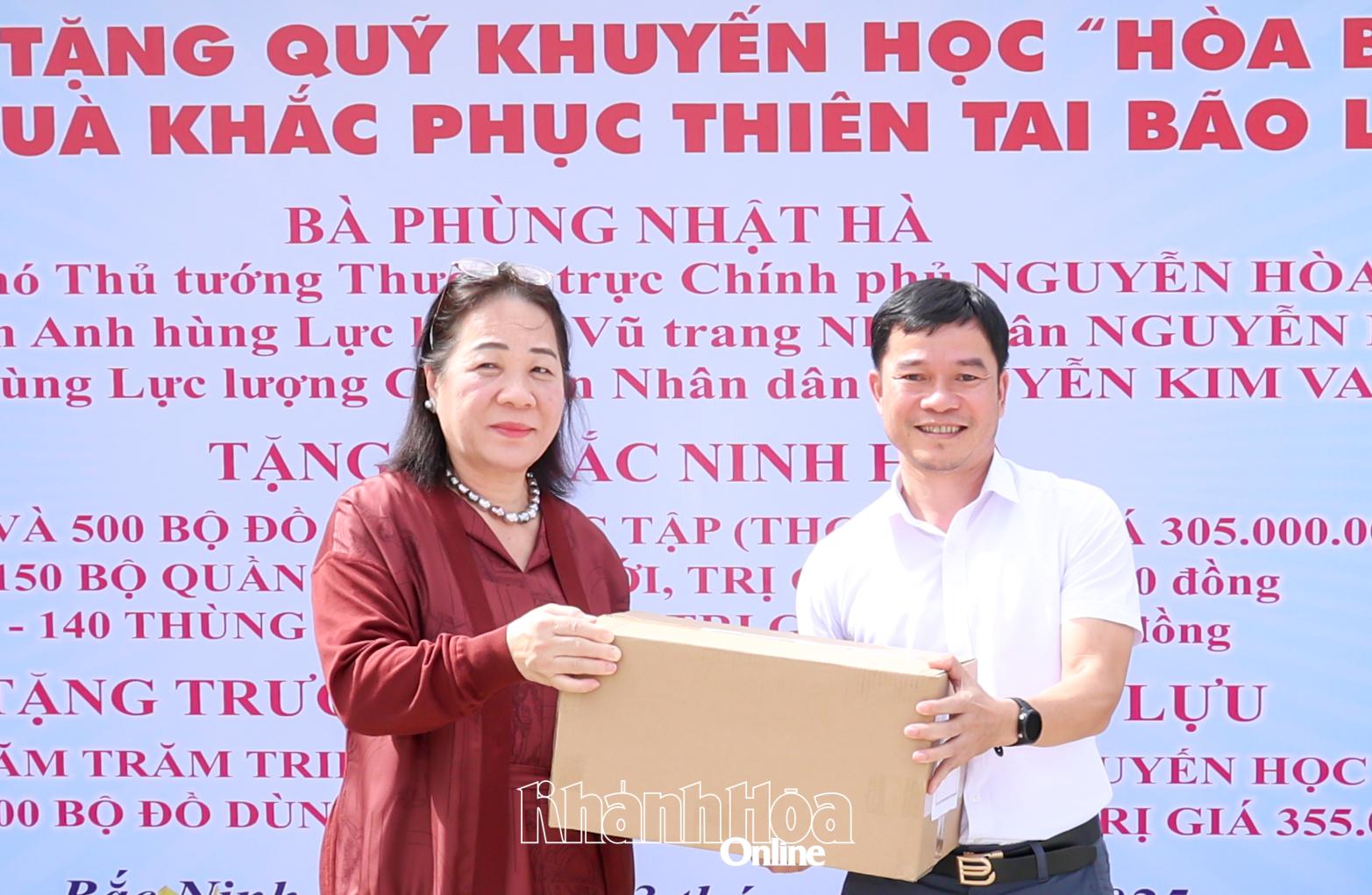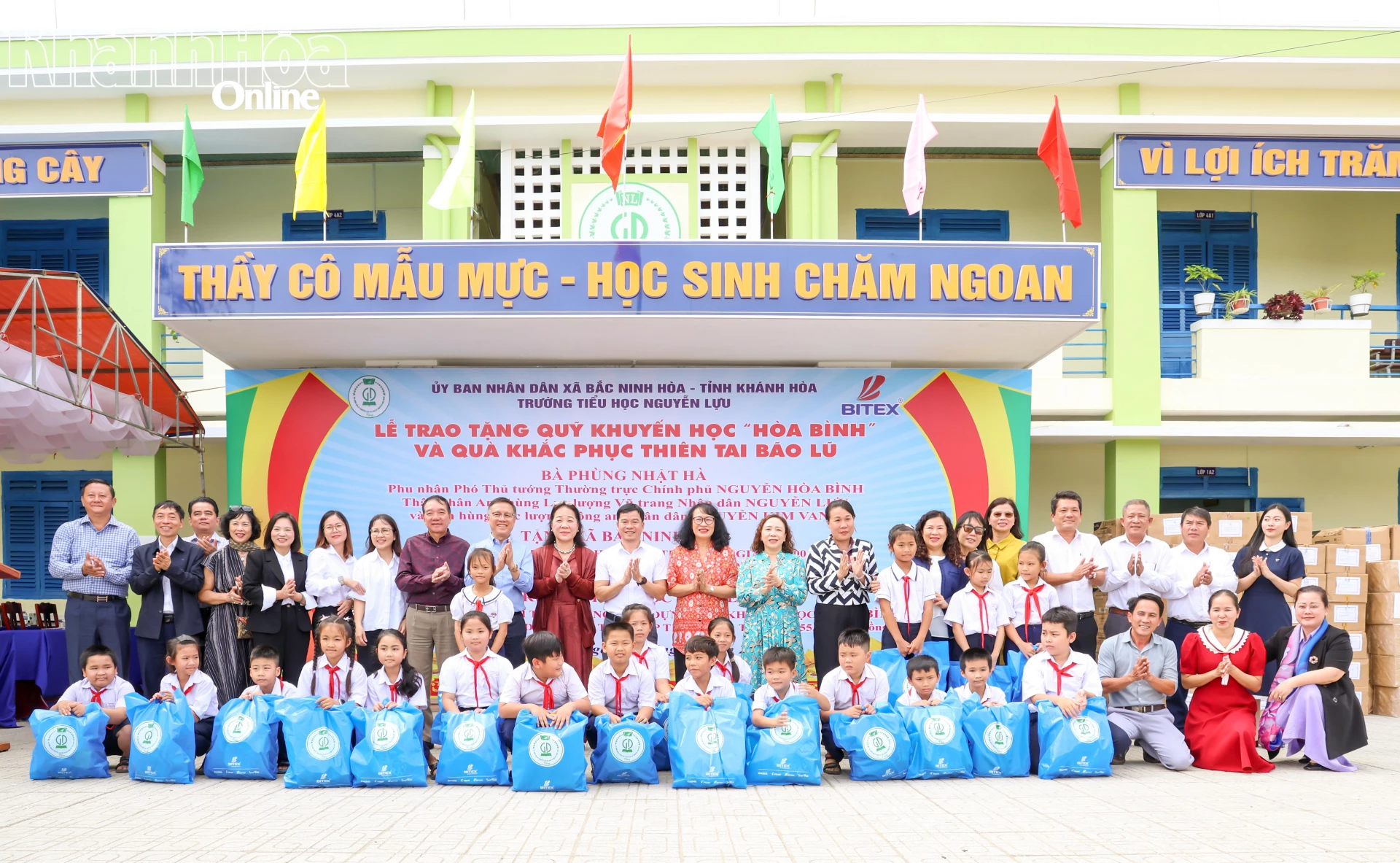 ក្នុងនាមគណៈប្រតិភូ លោកស្រី ភុង ញ៉ាត់ហា បានសម្តែងការចូលរួមរំលែកទុក្ខជាមួយប្រជាជន លោកគ្រូ អ្នកគ្រូ និងសិស្សានុសិស្សនៃឃុំបាក់និញហ័រ ចំពោះការខូចខាត និងការខាតបង់ដែលបង្កឡើងដោយទឹកជំនន់ថ្មីៗនេះ។ ដើម្បីឆ្លើយតបទៅនឹងការលំបាកទាំងនេះ ក្រុមគ្រួសារ និងសាច់ញាតិរបស់វីរបុរសកងកម្លាំងប្រដាប់អាវុធប្រជាជន ង្វៀន លូវ និងវីរបុរសសន្តិសុខសាធារណៈប្រជាជន ង្វៀន គីម វ៉ាង បានរៀបចំការបរិច្ចាគអំណោយ ដើម្បីជួយលើកទឹកចិត្ត និងចែករំលែកការលំបាកដែលប្រជាជនក្នុងតំបន់ លោកគ្រូ អ្នកគ្រូ និងសិស្សានុសិស្សនៃសាលាបឋមសិក្សា ង្វៀន លូវ ជួបប្រទះ។ ឯកសណ្ឋានសាលា និងសម្ភារៈសិក្សា គឺជាអំណោយតូចៗ ដើម្បីលើកទឹកចិត្តសិស្សានុសិស្សឱ្យជំនះការលំបាក បន្តការសិក្សា និងក្លាយជាកូនល្អ និងសិស្សល្អ រួមចំណែកដល់សង្គម។