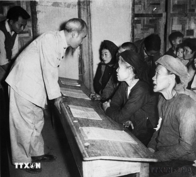 ប្រធានហូជីមិញបានទៅទស្សនាថ្នាក់បំប៉នវប្បធម៌សម្រាប់ស្ត្រីធ្វើការនៅសង្កាត់ Luong Yen ទីក្រុងហាណូយ (ថ្ងៃទី២៧ ខែមីនា ឆ្នាំ១៩៥៦)។ (រូបថត៖ បណ្ណសារ VNA) |