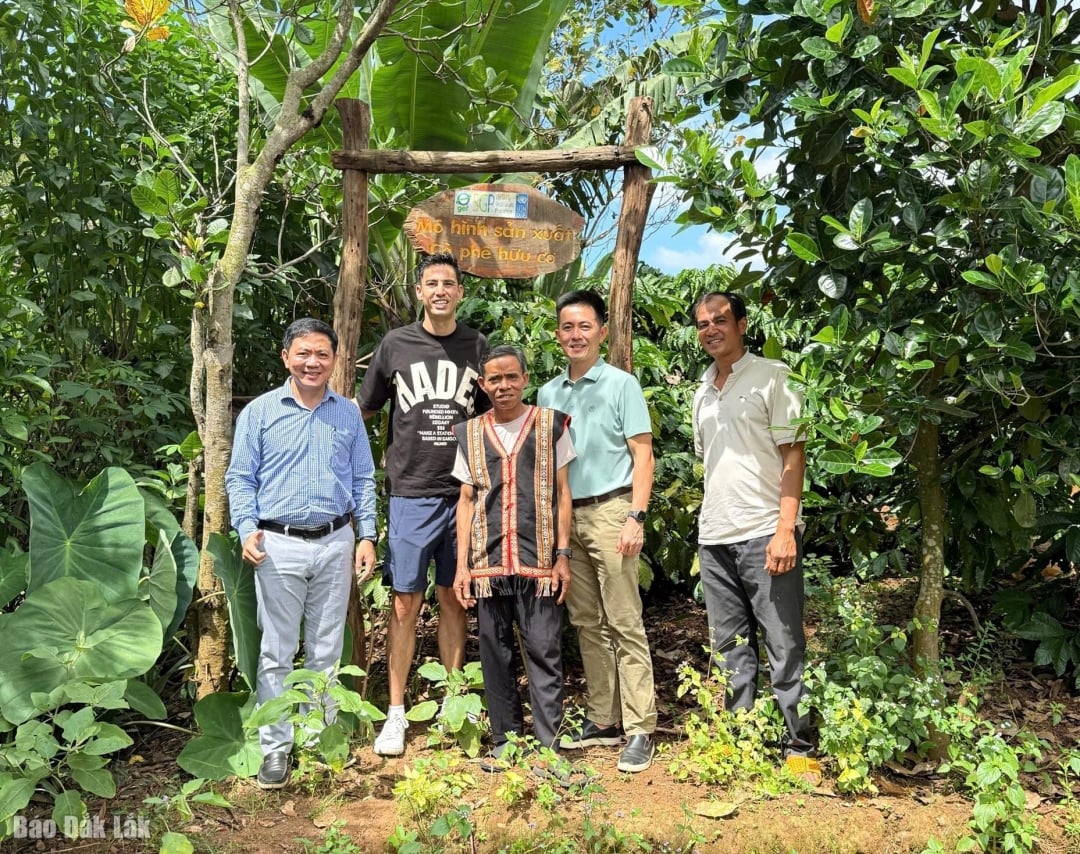 | លោក Pham The Thanh (គម្របខាងឆ្វេង) ដឹកនាំភ្ញៀវទេសចរទៅទស្សនាគំរូផលិតកម្មកាហ្វេសរីរាង្គរបស់គ្រួសារមួយនៅឃុំ Dak Phoi ។ |