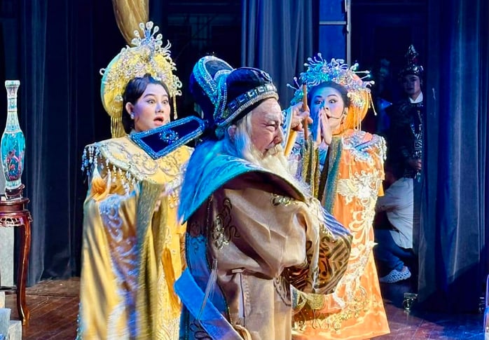 ពីឆ្វេងទៅស្តាំ៖ វិចិត្រករប្រជាជន Que Tran សិល្បករកិត្តិយស Truong Son សិល្បករ Le Thanh Thao ក្នុងវគ្គដកស្រង់ “កំណាព្យ Saddle” (យប់ថ្ងៃទី ១៨ តុលា នៅរោងមហោស្រព Tran Huu Trang)