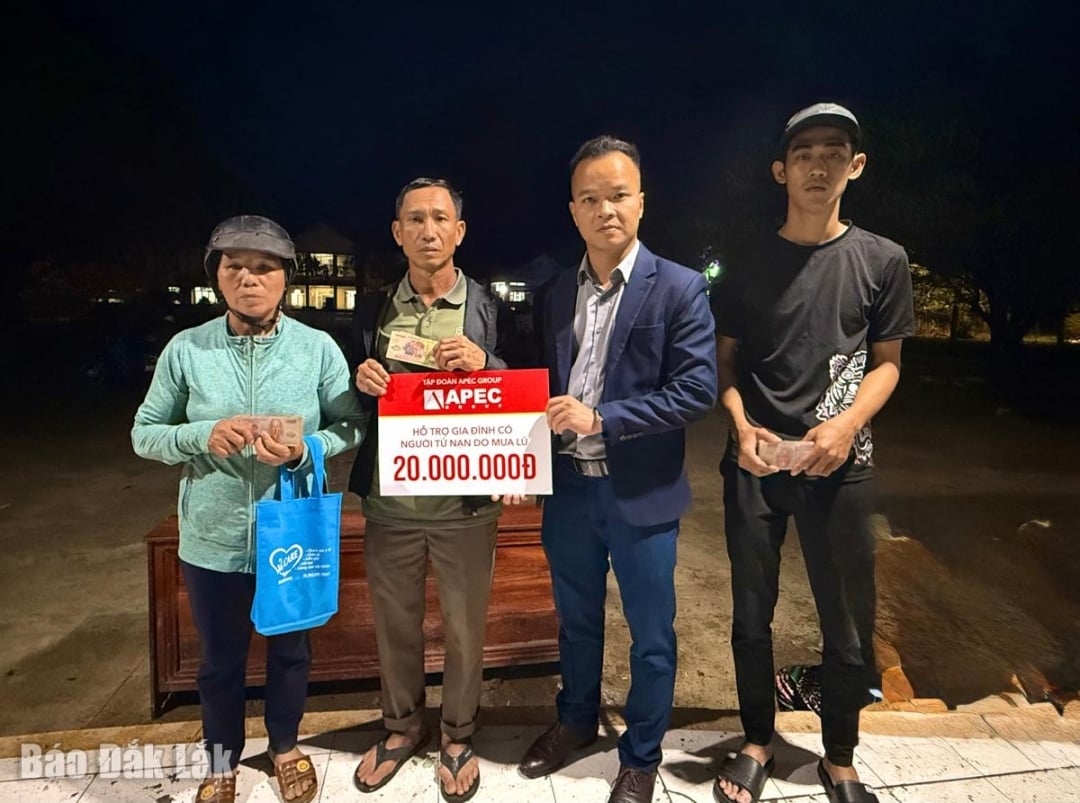 គណៈប្រតិភូមកពី APEC Group រួមមានលោកស្រី Vu Thi Thanh Huyen (ជំនួយការ APEC Group) និងលោក Pham Van Than នាយកក្រុមហ៊ុន Mandala Hotel and Service Management Joint Stock Company សាខា Phu Yen (Mandala Hotel & Spa Phu Yen) បានចុះពិនិត្យដោយផ្ទាល់នៅតំបន់រងគ្រោះ ដើម្បីផ្តល់ការគាំទ្រ និងផ្តល់ជំនួយហិរញ្ញវត្ថុដល់ជនរងគ្រោះដោយទឹកជំនន់។