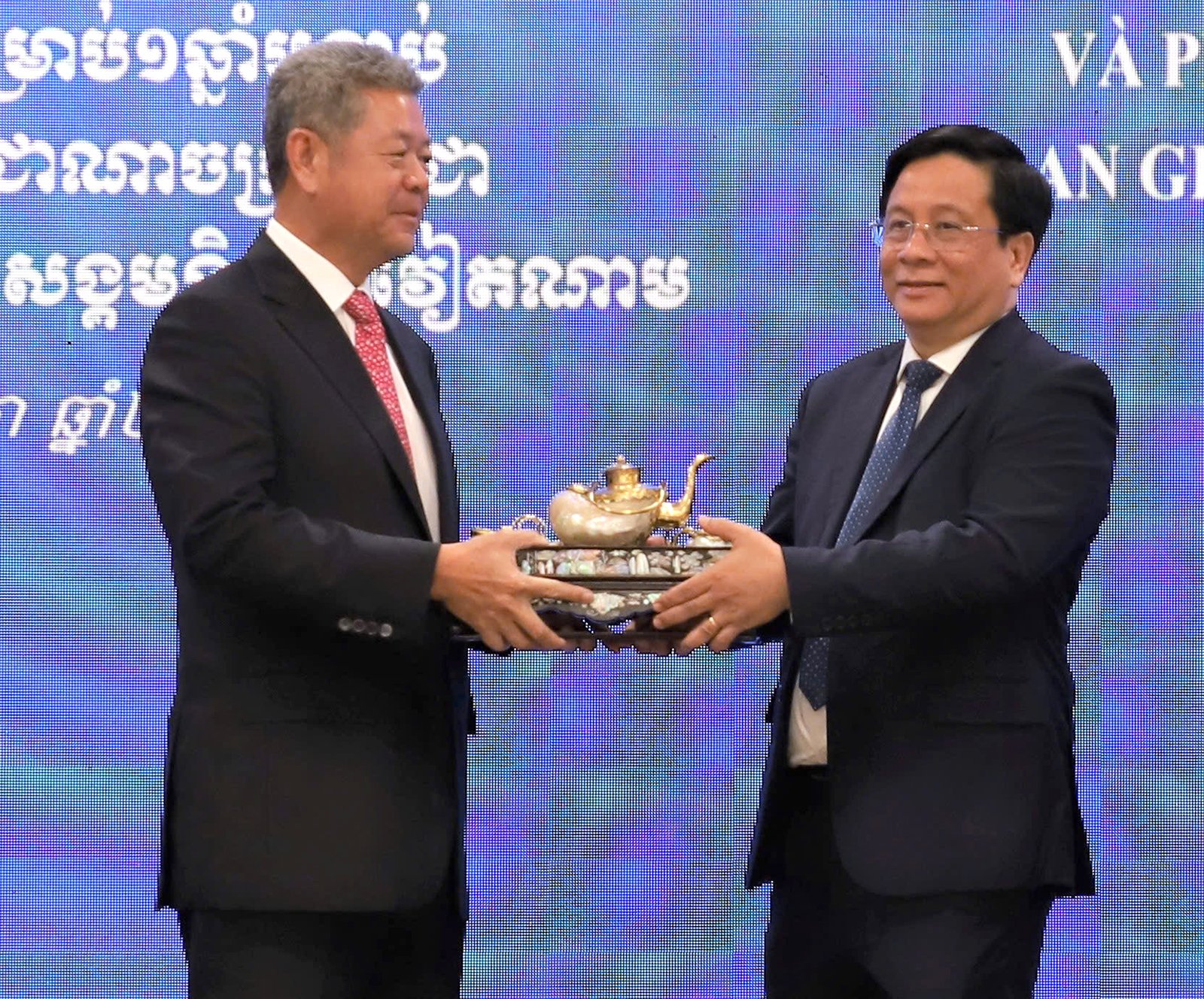 អភិបាលខេត្តកណ្តាល គួច ចំរើន (ឆ្វេង) ប្រគល់អំណោយជូនប្រធានគណៈកម្មាធិការប្រជាជនខេត្ត An Giang លោក Ho Van Mung ។
