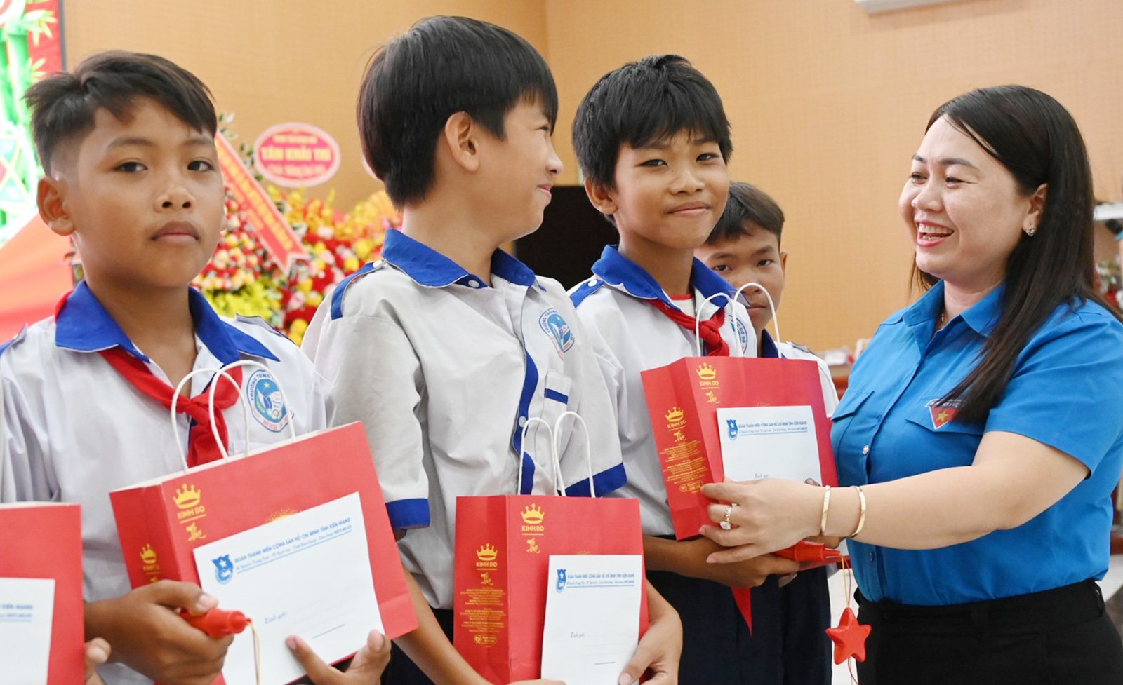 អនុលេខាអចិន្ត្រៃយ៍នៃសហភាពយុវជនខេត្ត ប្រធានសហភាពយុវជន និងកិច្ចការកុមារនៃគណៈកម្មាធិការរណសិរ្សមាតុភូមិវៀតណាមខេត្ត An Giang លោកស្រី Thi Phuong Hong បានជូនអំណោយដល់កុមារ។