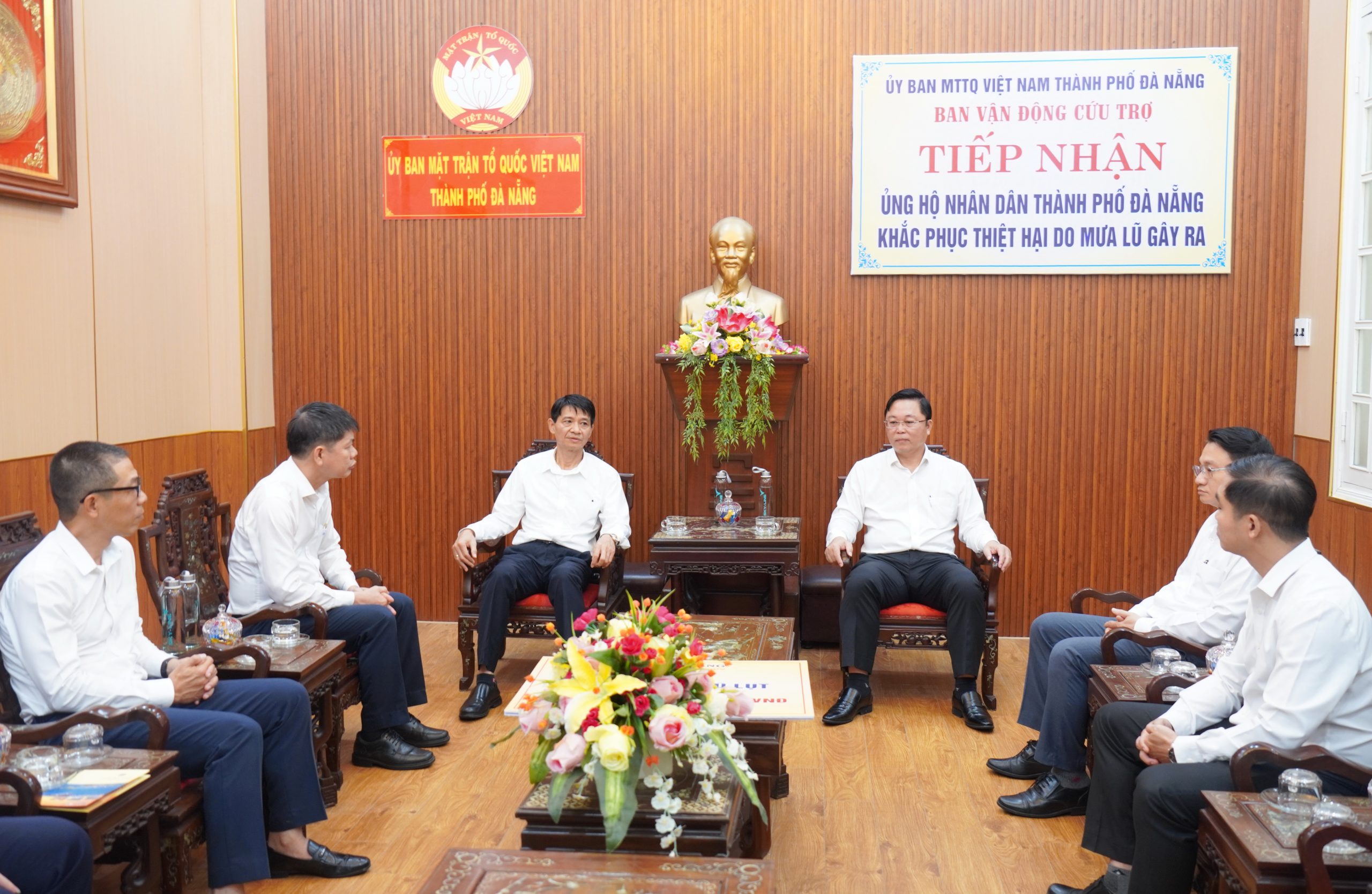 ក្នុងពិធីទទួល លោក Le Tri Thanh ប្រធានគណៈកម្មាធិការរណសិរ្សមាតុភូមិវៀតណាមទីក្រុង Da Nang (រូបភាពខាងលើ អង្គុយកណ្តាល-ស្តាំ) និងលោក Nguyen Thanh Binh សមាជិកគណៈកម្មាធិការបក្ស អនុប្រធានអចិន្ត្រៃយ៍ទីក្រុង Hue (រូបភាពខាងក្រោមពាក់អាវពណ៌ខៀវឈរ) បានសម្តែងនូវអំណរគុណយ៉ាងជ្រាលជ្រៅចំពោះបេះដូងមាសរបស់កំពង់ផែដឹកជញ្ជូនជាតិវៀតណាម និងកំពង់ផែ Da Nang។
