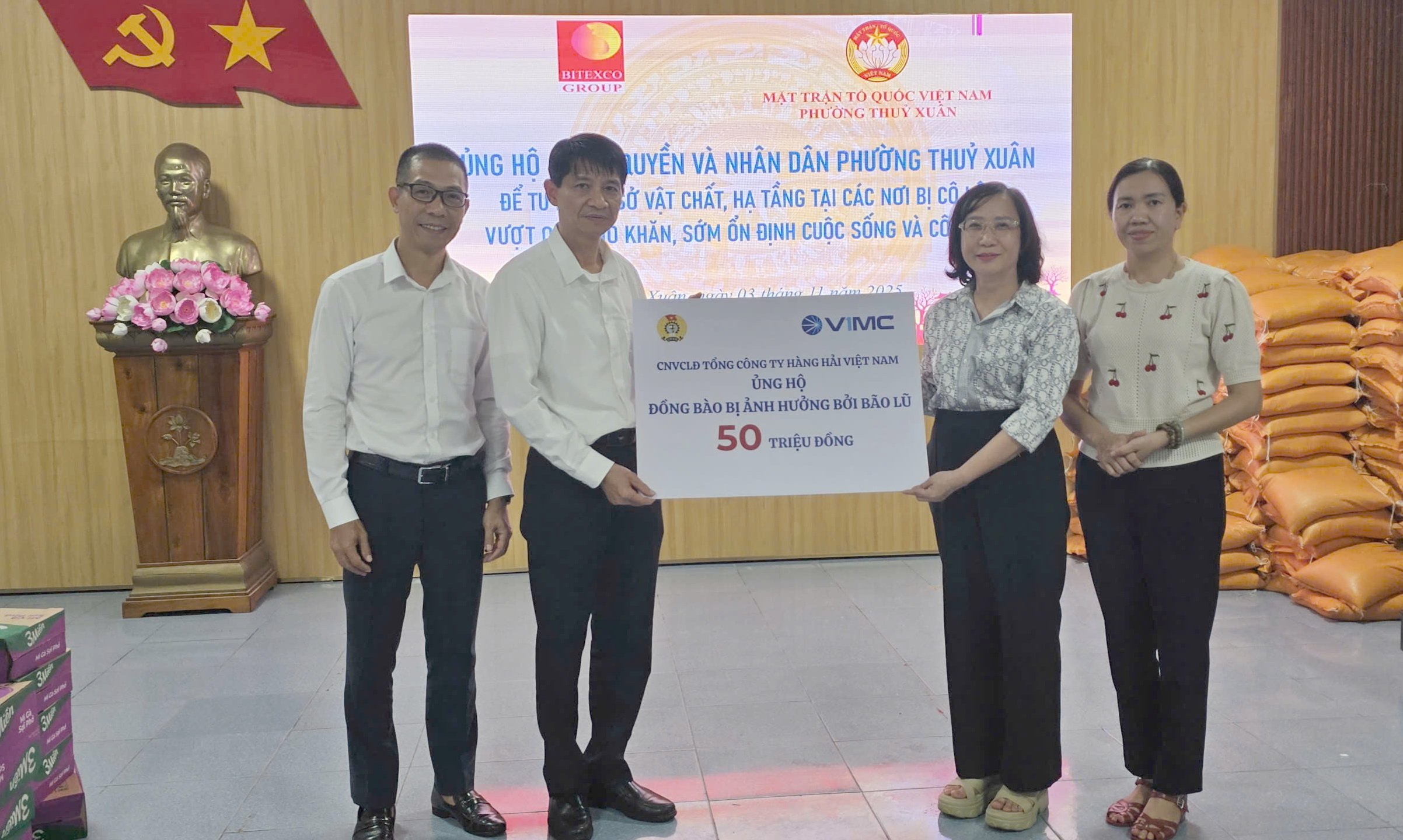 តំណាងឲ្យខ្សែនាវាជាតិវៀតណាម លោក Pham Van Hai សមាជិកគណៈកម្មាធិការប្រតិបត្តិ នៃសហព័ន្ធការងារវៀតណាម អនុប្រធានសម្ព័ន្ធសហជីពនៃខ្សែដឹកជញ្ជូនជាតិវៀតណាម រួមជាមួយលោក Nguyen Tuan Hai ប្រធានអគ្គលេខាធិការដ្ឋាន តាងនាមបុគ្គលិក និងនិយោជិត VIMC ទាំងអស់បានប្រគល់ថវិកាសរុបចំនួន 1,550 ពាន់លានដុង។