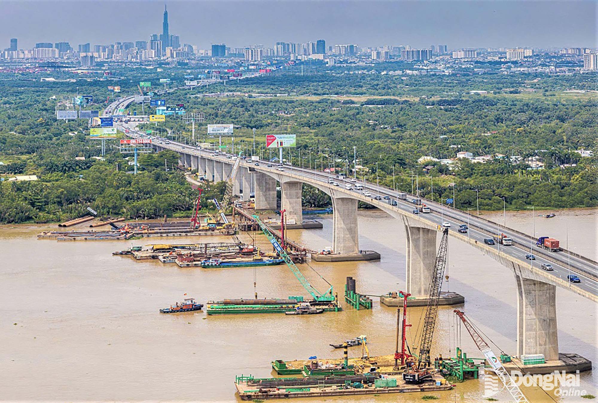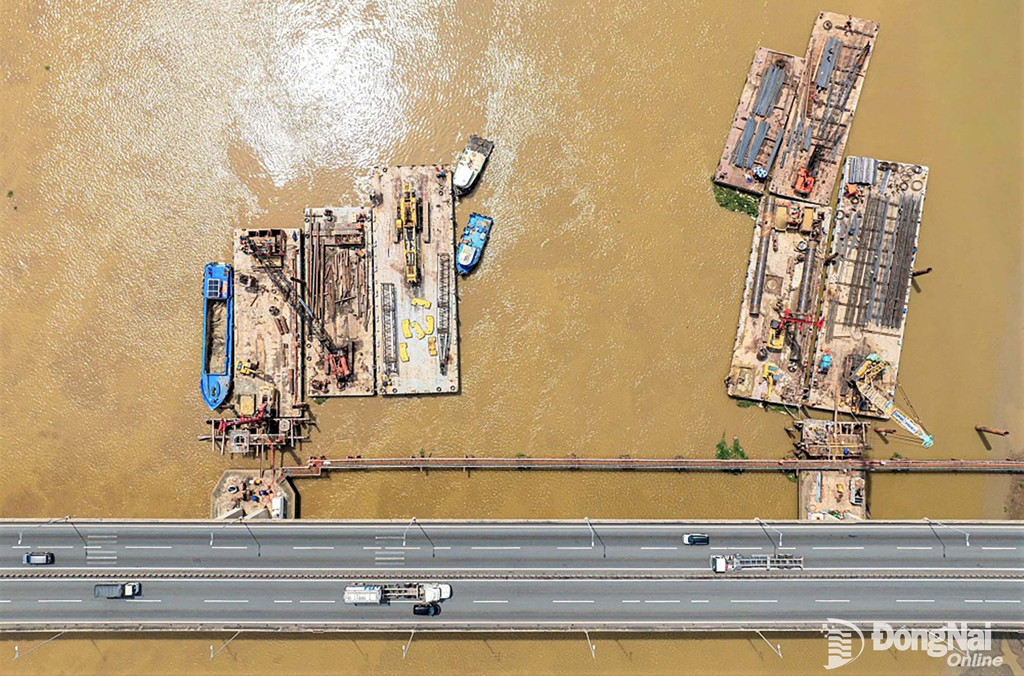 | ស្ពាន Long Thanh ដែលទើបនឹងសាងសង់ថ្មីនេះ មានប្រវែង ២,៣គីឡូម៉ែត្រ និងមានផ្លូវចំនួន ៥។ បច្ចុប្បន្ន អ្នកម៉ៅការកំពុងកៀរគរចង្កោមឧបករណ៍ឯកទេសចំនួន ៥ ដែលចង្កោមនីមួយៗរួមមាន ធុងបាស ស្ពានអណ្តែតទឹក និងម៉ាស៊ីនខួង ដើម្បីបម្រើការសំណង់នេះ។ រូបថត៖ Pham Tung |