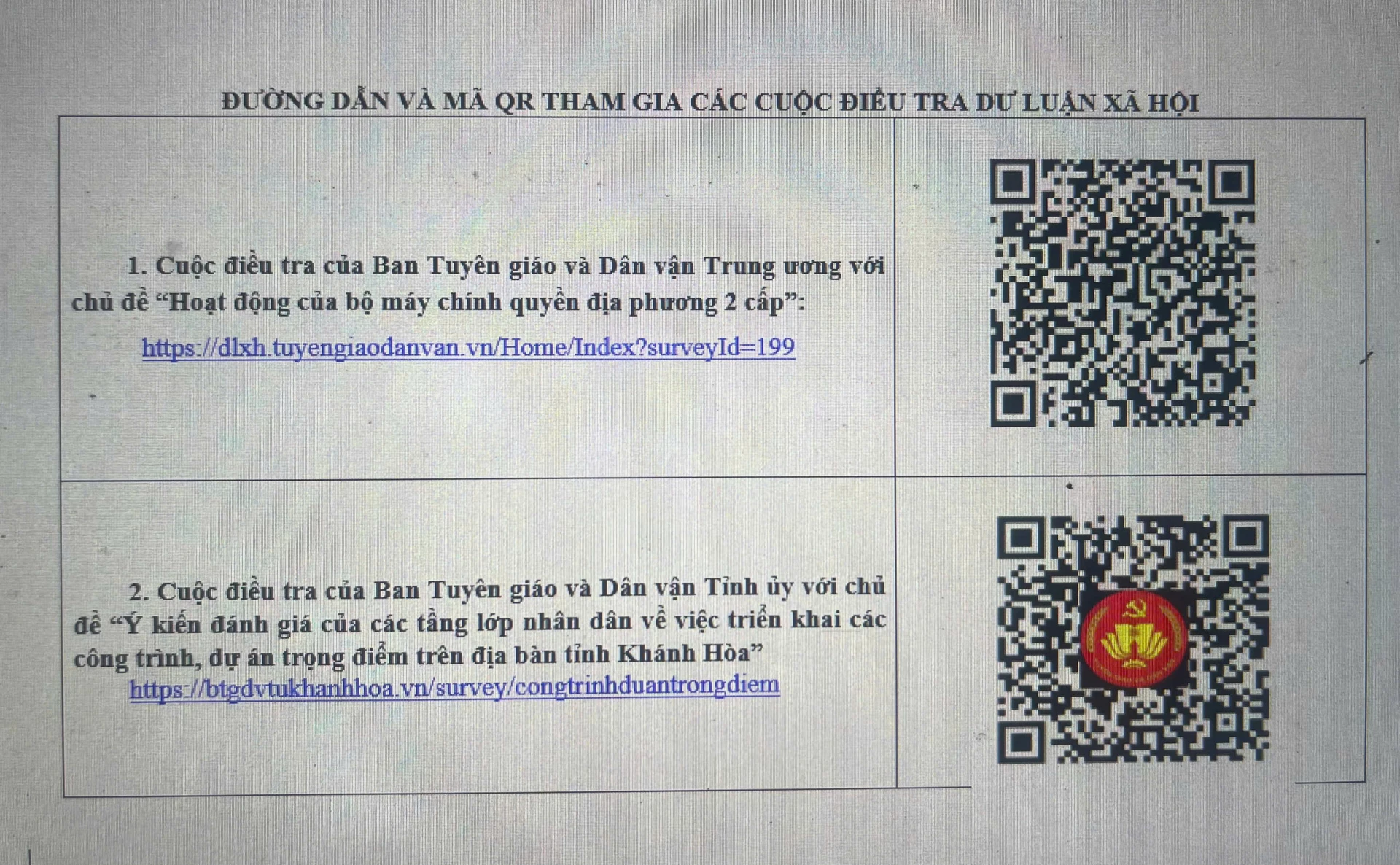 ១. ការស៊ើបអង្កេតដោយនាយកដ្ឋានឃោសនាការកណ្តាល និងចលនាមហាជន លើប្រធានបទ "ប្រតិបត្តិការនៃបរិធានរដ្ឋាភិបាលមូលដ្ឋានពីរជាន់"៖ https://dlxh.tuyengiaodanvan.vn/Home/Index?surveyId=199 |