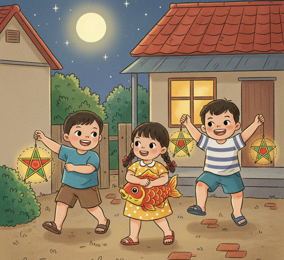 ព្រះច័ន្ទពេញបូណ៌មីភ្លឺនៅលើមេឃ ជីដូនរបស់នាងបានអុជទឹកតែ ម្តាយរបស់នាងកាត់នំព្រះខែ ឃើញការបំពេញចម្រុះ ប្អូនប្រុសរបស់នាងបានញ៉ាំមួយដុំធំ ហើយរត់ជុំវិញទីធ្លាដោយចង្កៀងគោម។ នាងញញឹមពេលទទួលនំពីម្តាយ ដោយគិតក្នុងចិត្តថាឆ្នាំនេះជាពិធីបុណ្យពាក់កណ្តាលរដូវស្លឹកឈើជ្រុះដ៏ផ្អែមល្ហែម និងរីករាយបំផុតសម្រាប់នាង និងបងប្អូនតាំងពីឪពុកបានទទួលមរណភាព។/.