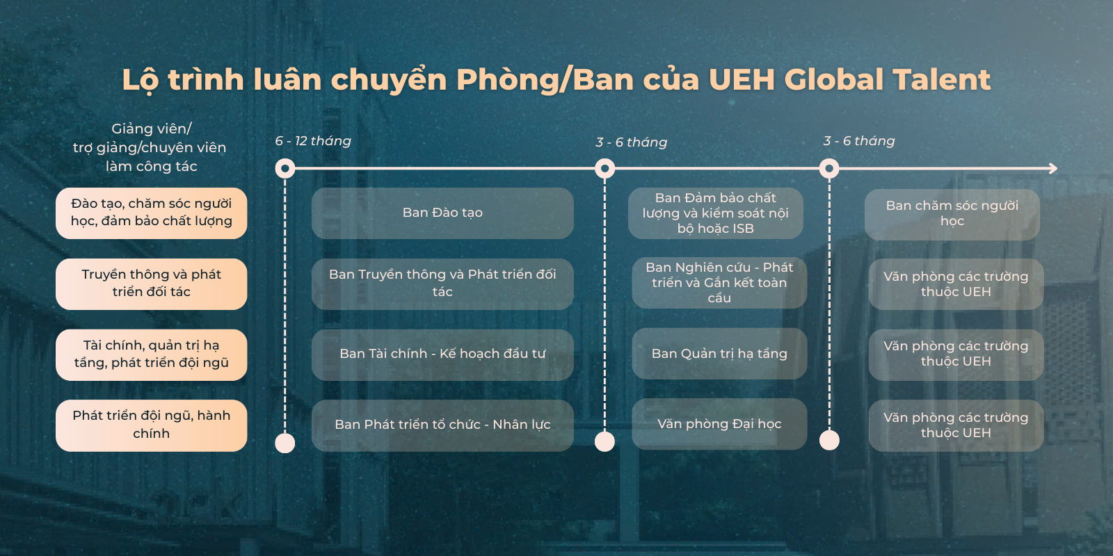 បន្ទាប់ពីត្រូវបានជ្រើសរើស បេក្ខជននឹងធ្វើការនៅបរិវេណសំខាន់របស់ UEH ជាសិក្ខាកាមក្រោមរបបកម្មសិក្សា/កម្មសិក្សា។ រយៈពេលបណ្តុះបណ្តាលត្រូវបានរៀបចំជាប្រព័ន្ធសម្រាប់រយៈពេល 12 ខែសម្រាប់បេក្ខជនដែលមានសញ្ញាប័ត្រអនុបណ្ឌិត ឬខ្ពស់ជាងនេះ ឬចាប់ពីពេលបញ្ចប់មូលដ្ឋាននៃកម្មវិធីបណ្តុះបណ្តាលអនុបណ្ឌិតសម្រាប់បេក្ខជនដែលនៅសល់ ដោយមានរយៈពេលសរុបមិនលើសពី 24 ខែ។