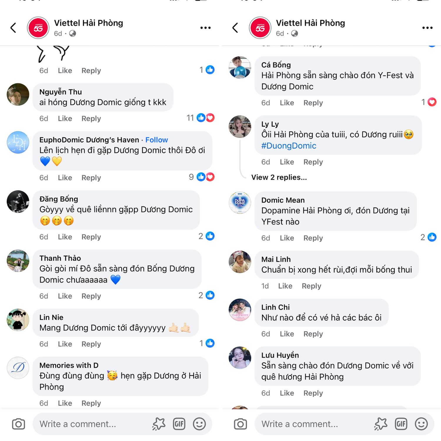ជាពិសេស រូបរាងរបស់កូនប្រុស "បូព៌ា" - បងប្រុសរបស់ Duong Domic បានទាក់ទាញចំណាប់អារម្មណ៍របស់អ្នកស្រុក Hai Phong ជាច្រើន។ នៅលើទំព័រហ្វេកប៊ុកផ្លូវការរបស់ Viettel Hai Phong អតិថិជនបានបន្សល់ទុកនូវមតិនានាដែលបង្ហាញពីភាពអន្ទះសារក្នុងការស្វាគមន៍សិល្បករប្រុសមកសម្តែងនៅស្រុកកំណើត។
