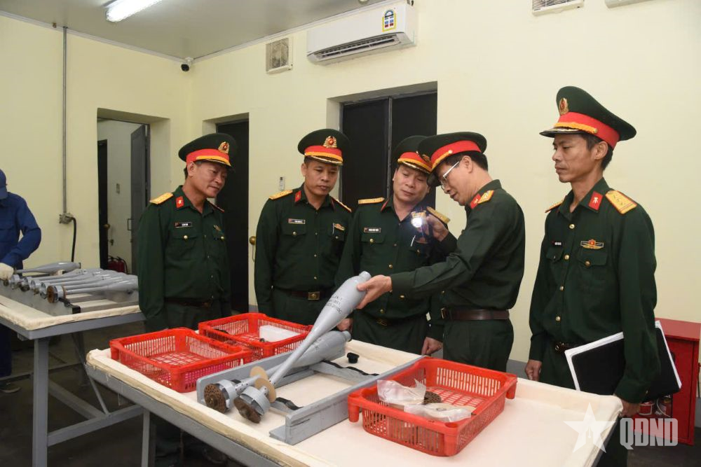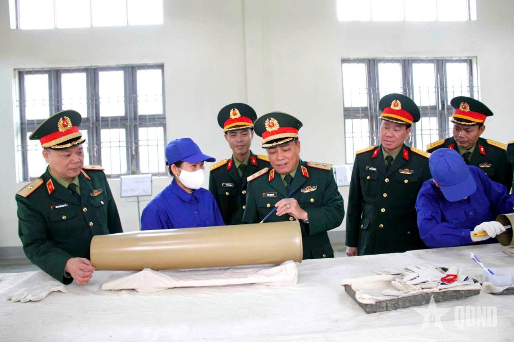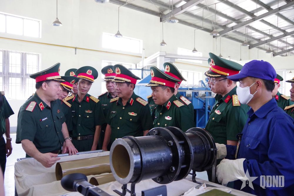 លោកវរសេនីយ៍ឯក Ha Dinh Diep លេខាបក្ស អនុប្រធាននាយកដ្ឋានសព្វាវុធយោធា (ទីពីរពីស្តាំ) ចុះពិនិត្យការងារជួសជុលគ្រាប់រំសេវ DKZ 82mm នៅរោងចក្រ X265។ |