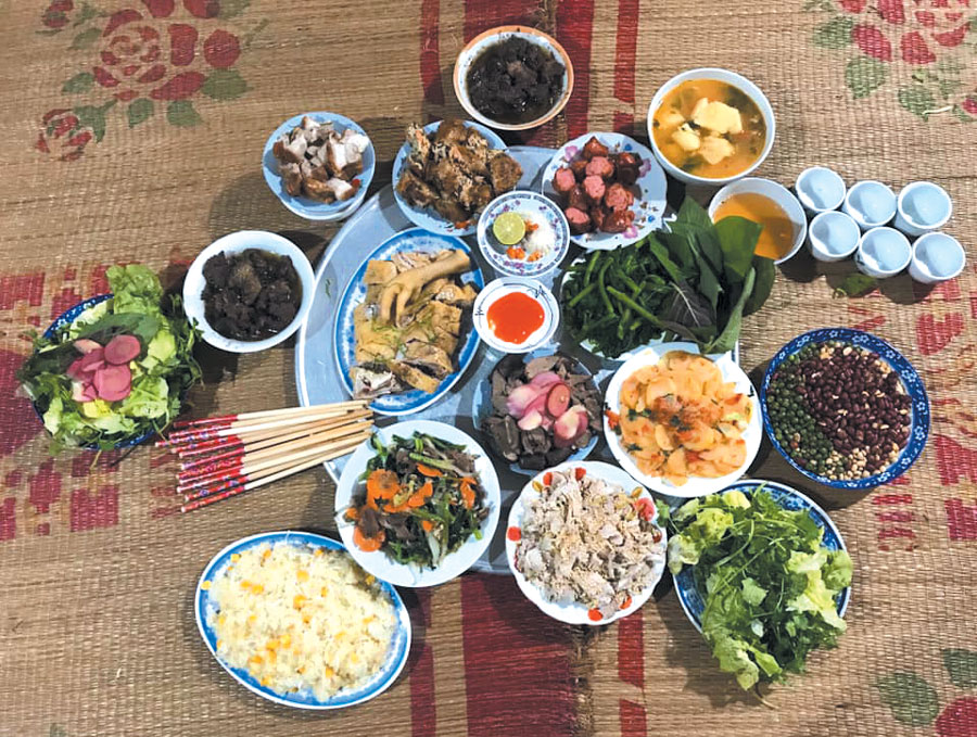 옛 혼례식의 메인 요리는 보통 삶은 닭고기, 돼지고기 롤, 기름진 돼지고기 롤, 잡채, 죽순탕, 감자탕, 바나나탕, 소고기 볶음, 찹쌀밥 등으로 구성되었습니다. 이후 경제 생활이 발전하면서 삶은 새우, 생선찜, 오징어볶음, 비둘기찜 등 다양한 요리가 등장했습니다. 요리는 보기에도 좋고 보기에도 좋도록 장식하는 경우가 많았습니다. 기일, 집들이, 아이들의 한 달 잔치 등에서 차려지는 음식은 비교적 간소했지만, 기본적으로 삶은 닭고기, 돼지고기 롤, 찹쌀밥, 그리고 볶음 요리가 기본이었습니다.
