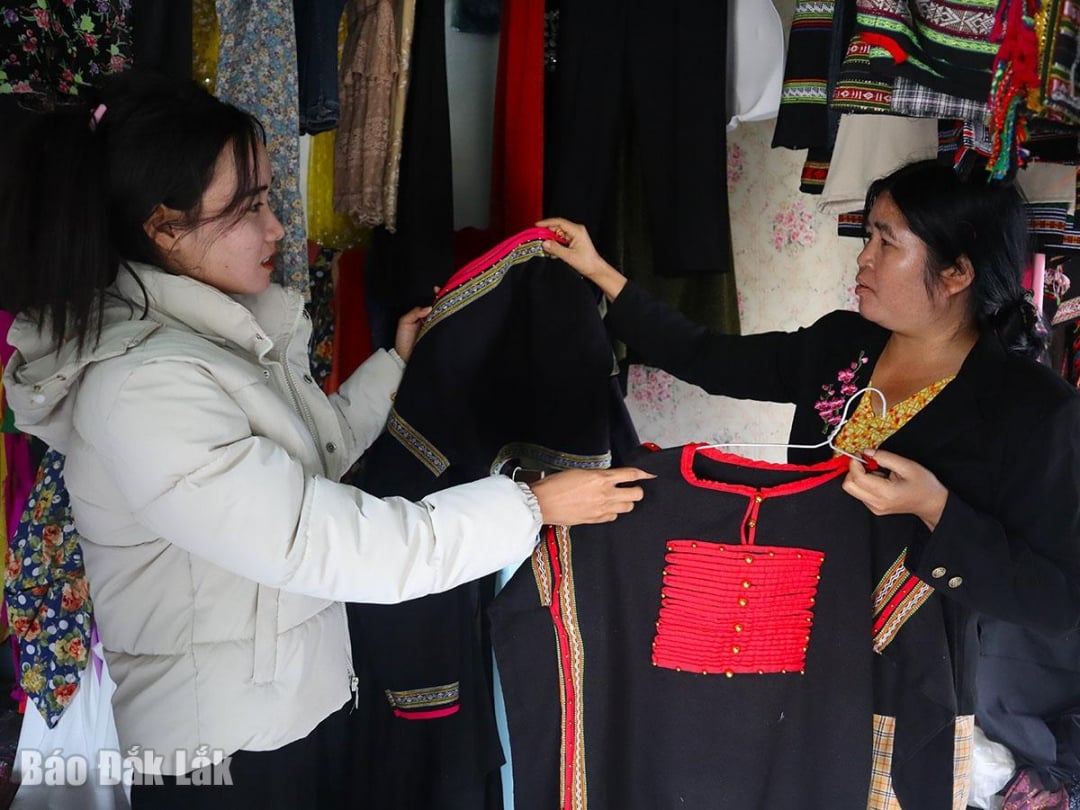 비엡 마을 출신인 H. 딘 리엥 씨는 전통 의상 재봉 강좌에 참여하여 지속 가능한 길을 찾았고, 재봉은 오랫동안 그녀의 주요 직업이 되었습니다. 그녀는 종교 의식, 결혼식, 파티와 같은 중요한 행사에 마을 사람들을 위해 브로케이드 의상을 만드는 것을 전문으로 합니다. 재봉은 안정적인 수입을 제공할 뿐만 아니라 므농족과 에데족의 전통 브로케이드 의상을 유지하고 보존하는 데에도 도움이 됩니다.