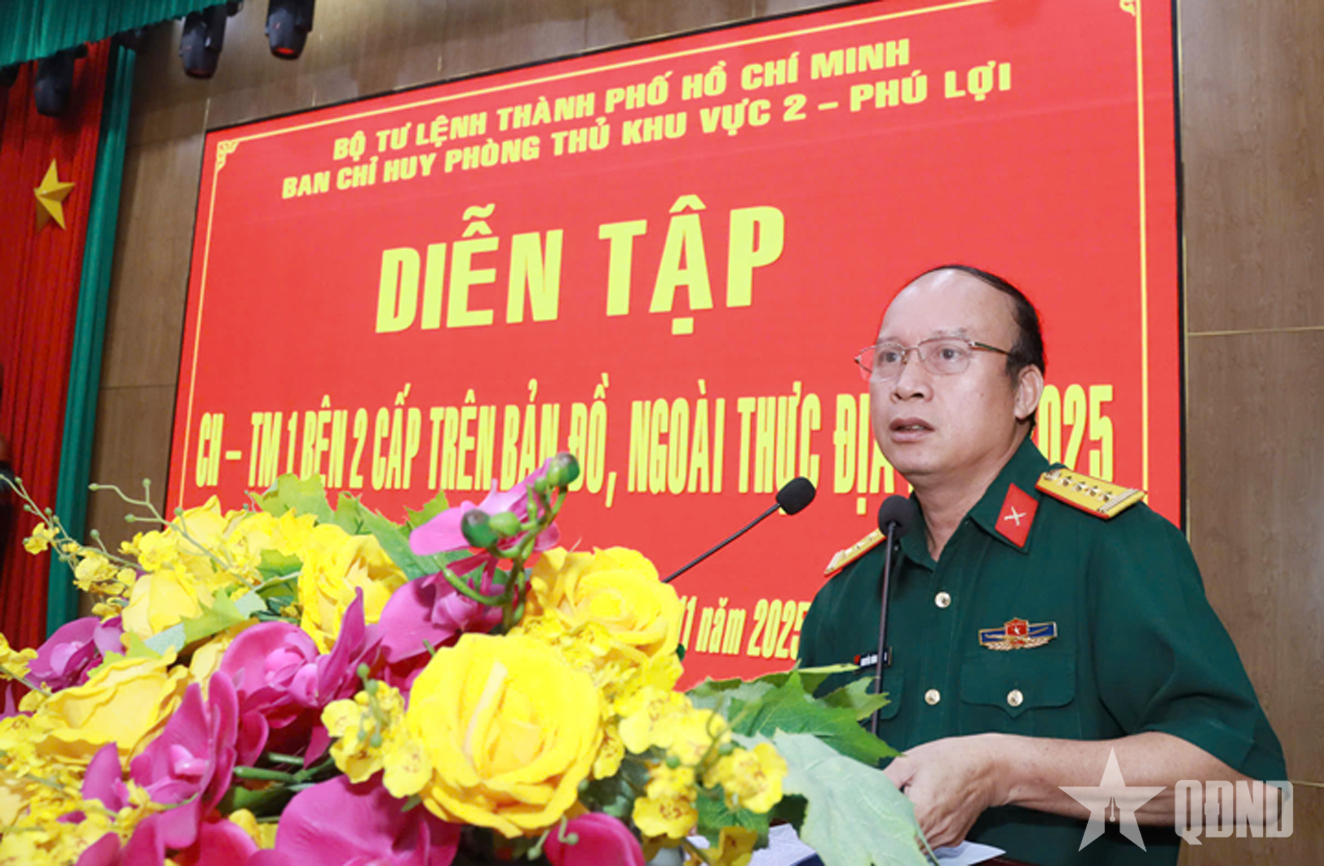 | 호치민시 사령부의 부정치위원인 응우옌 딘 추안 대령이 훈련을 지시하는 연설을 했습니다. |