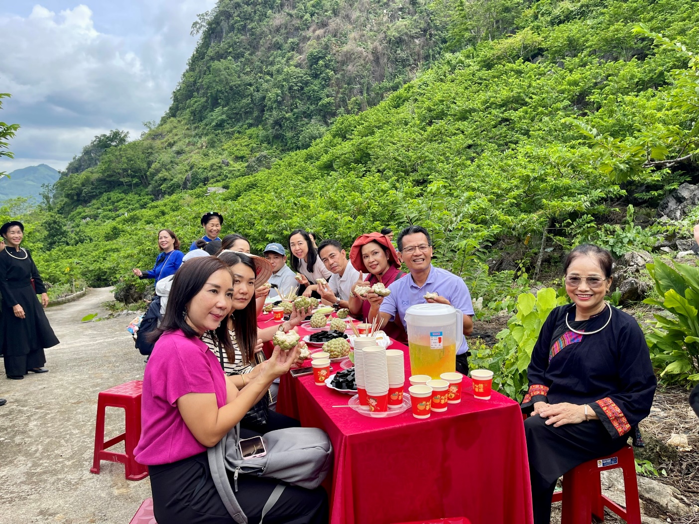그 직후, 대표단은 찌랑(Chi Lang) 마을 룽컷(Lung Cut) 지역의 커스터드애플 재배 모델을 방문했습니다. 이곳은 뛰어난 품질을 자랑하는 찌랑 커스터드애플 품종으로 유명하며, 랑선(Lang Son)성의 대표적인 농업 브랜드로 자리 잡았습니다. 대표단은 커스터드애플 텃밭에서 커스터드애플 재배, 수확, 소비 과정을 직접 체험하고, 커스터드애플 나무가 소수 민족에게 가져다주는 경제적 효율성에 대한 이야기를 경청했습니다.