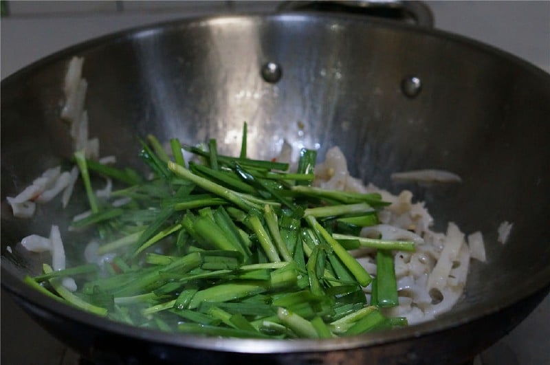 - 연근을 한동안 볶은 후, 간을 맞추고 잘 저어줍니다. 다진 부추를 넣고 재료가 잘 섞이도록 잘 저어줍니다. 부추가 짙은 녹색으로 변하면 고춧가루를 약간 넣어 풍미를 더합니다. 양념이 잘 배고 익으면 불을 끄고 접시에 담아냅니다.