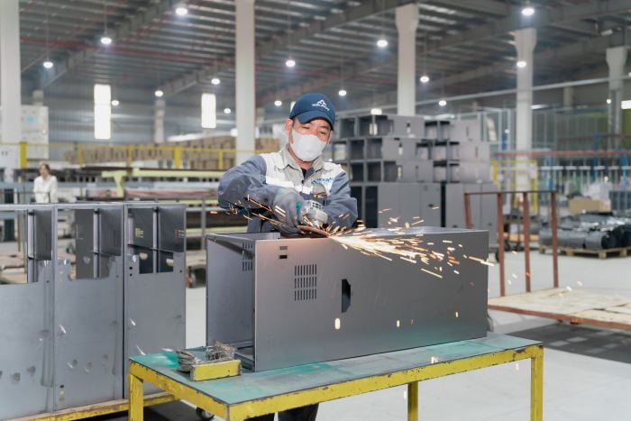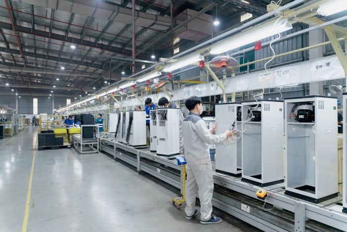역삼투압 정수기의 철제 프레임은 공장에서 직접 제작됩니다.호아팟 HPA885 냉온수 RO 알칼리 수소이온 정수기는 하남성 두이띠엔현 호아막 산업단지에 위치한 호아팟 가전 공장에서 생산됩니다. 15헥타르 규모의 이 공장은 1조 VND를 투자하여 2022년부터 가동 중입니다. 증가하는 수요에 대응하기 위해 공장은 교대 근무제를 도입하고 공정을 개선했으며, 일일 1,000대 생산 능력을 갖춘 통합 기능성 필터 생산 라인을 가동했습니다. 이전에는 기능성 필터를 주로 수입했지만, 국내 생산으로 전환함으로써 공급과 품질 관리를 더욱 효율적으로 할 수 있게 되었습니다.