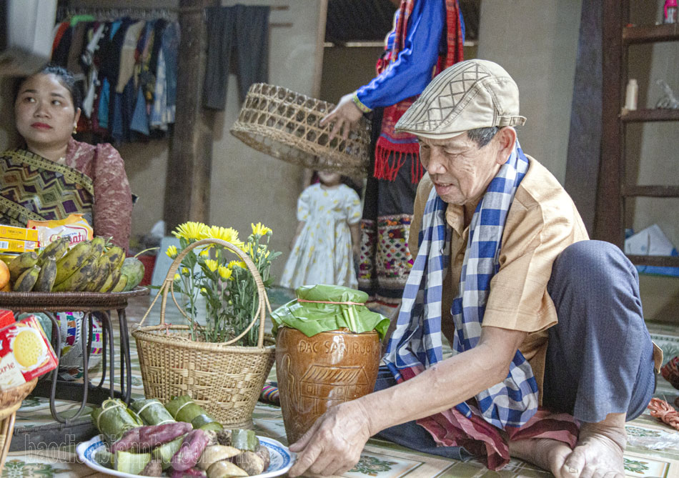 마을 사람들은 땅 주인과 정령들의 허락을 받은 후 물 축제를 위한 제물을 준비합니다. 제물은 주로 과자, 과일, 그리고 지역 농산물로 구성됩니다. 모든 사람들은 축제에 참여하여 전통 공연을 관람하고, 람봉 춤을 추고, 손목에 실을 묶고, 제물을 나르고, 물을 뿌리며 즐깁니다.