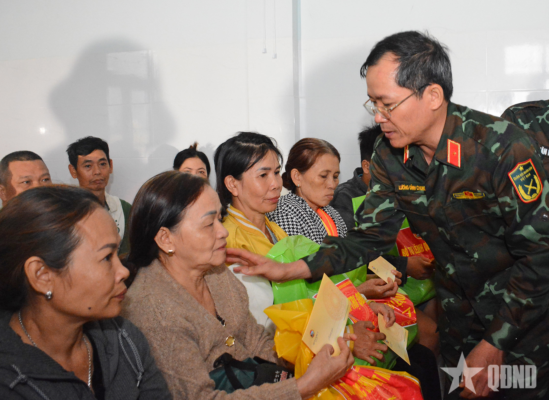| 5군구의 당 서기이자 정치위원인 루옹 딘 청 소장이 국민들에게 선물을 전달했습니다. |