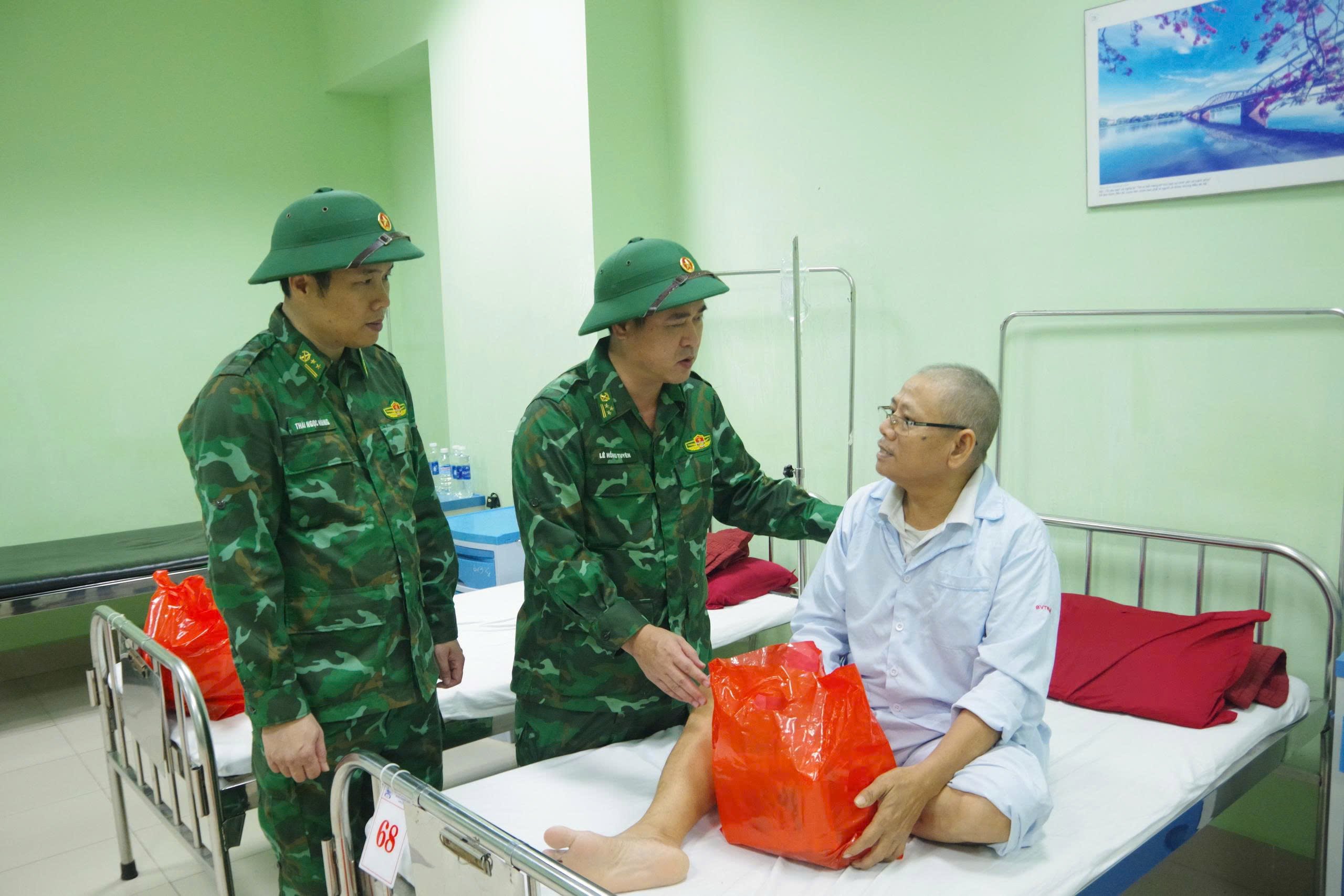 | 도시 국경수비대 부정치위원인 레 홍 투옌 중령이 수재민들에게 선물을 전달하고 격려했다. 사진: 국경수비대 |
