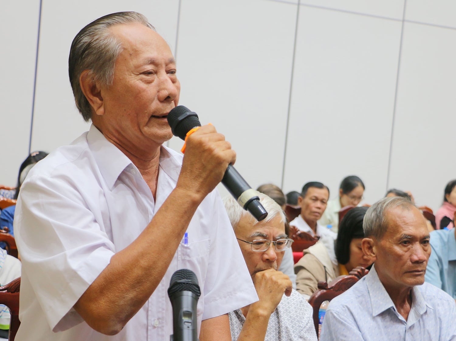 Cử tri phường Long Xuyên trình bày ý kiến tại buổi tiếp xúc cử tri sau Kỳ họp thứ 10, Quốc hội khóa XV. Ảnh: PHƯƠNG LAN