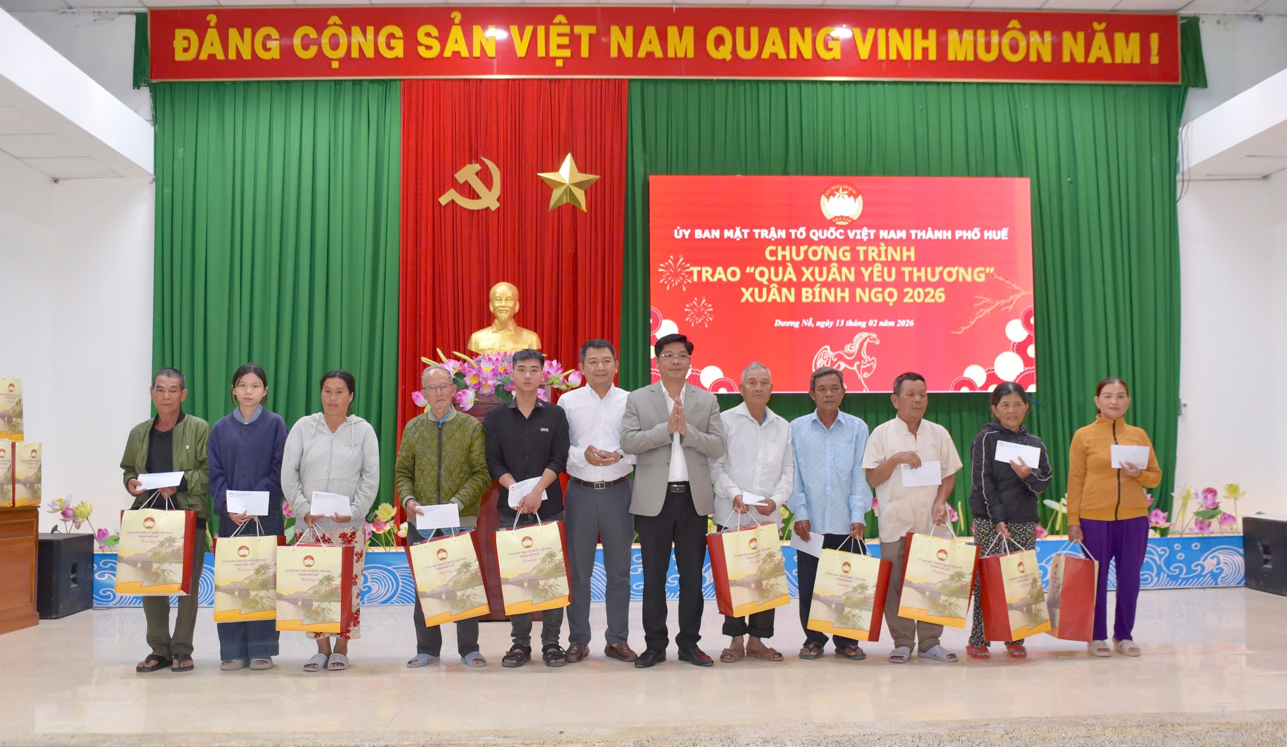 Cũng trong ngày 13/2 Ủy ban MTTQ Việt Nam phường Dương Nỗ tổ chức chương trình trao quà “Xuân yêu thương” năm 2026 cho các hộ nghèo, cận nghèo và hộ có hoàn cảnh khó khăn trên địa bàn nhân dịp tết Nguyên đán Bính Ngọ. Tham dự chương trình có đồng chí Nguyễn Chí Tài, Phó Bí thư Thành ủy, Chủ tịch Ủy ban MTTQ Việt Nam TP. Huế; đại diện lãnh đạo một số ban, ngành thành phố; lãnh đạo Đảng ủy, HĐND, UBND, Ủy ban MTTQ Việt Nam phường Dương Nỗ cùng đông đảo bà con nhân dân.