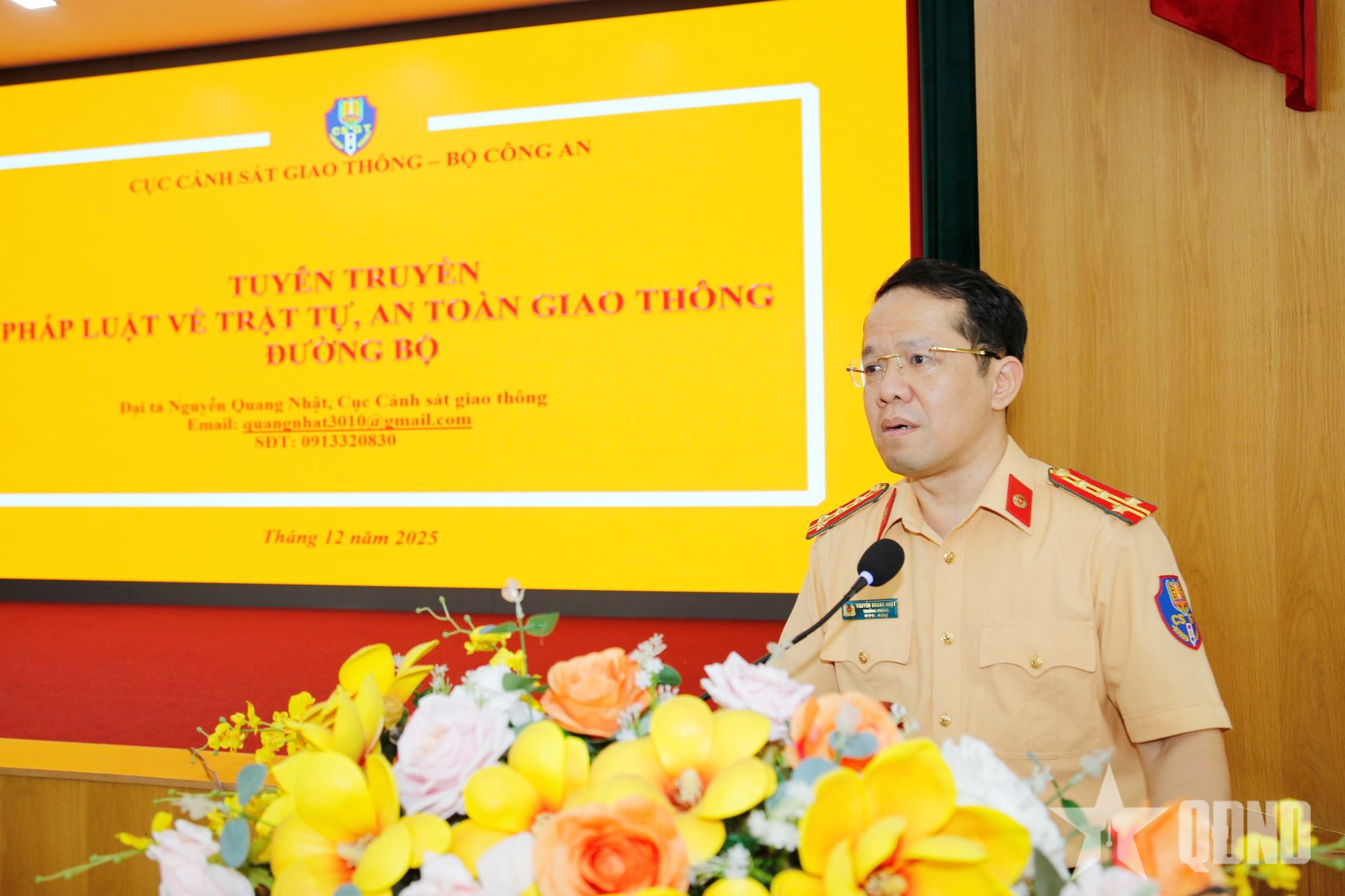 ທີ່ກອງປະຊຸມ, ທ່ານ ພັນເອກ ຫງວຽນກວາງຫງາຍ, ຫົວໜ້າກົມຊີ້ນໍາ, ໂຄສະນາ, ສືບສວນ-ສອບສວນ ແລະ ແກ້ໄຂອຸບັດຕິເຫດ, ກົມຕໍາຫຼວດຈະລາຈອນ ໄດ້ແຈ້ງໃຫ້ພະນັກງານ-ລັດຖະກອນ ກົມ 20 ຊາບກ່ຽວກັບກົດໝາຍຈະລາຈອນ, ຕັກເຕືອນກ່ຽວກັບອຸປະຕິເຫດຈະລາຈອນຜ່ານຄລິບ ວີດີໂອ ; ເນື້ອໃນກ່ຽວກັບການຮັບປະກັນຄວາມປອດໄພດ້ານຄວາມເປັນລະບຽບຮຽບຮ້ອຍ ແລະ ຈັນຍາບັນຂອງຜູ້ຂັບຂີ່, ປະກອບສ່ວນກໍ່ສ້າງວັດທະນະທຳຈະລາຈອນ.