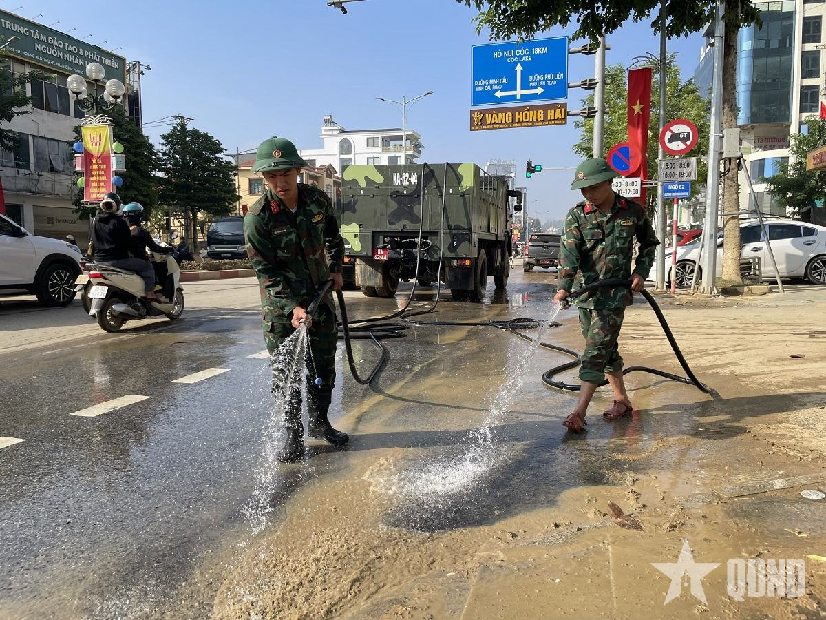 ພະນັກງານ, ນັກຮົບກອງພັນປ້ອງກັນເຄມີ 23 (ນາຍພົນທະຫານເຂດ 1) ລ້າງຂີ້ຕົມຢູ່ຖະໜົນ ຮວ່າງວັນທູ, ຕາແສງ ຟານດິ່ງເຟືອງ, ແຂວງ ໄທ ຫງວຽນ . ຮູບພາບ: VAN HIEU |
