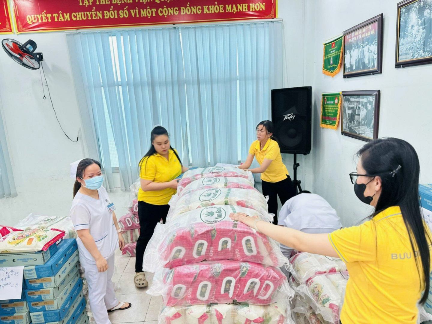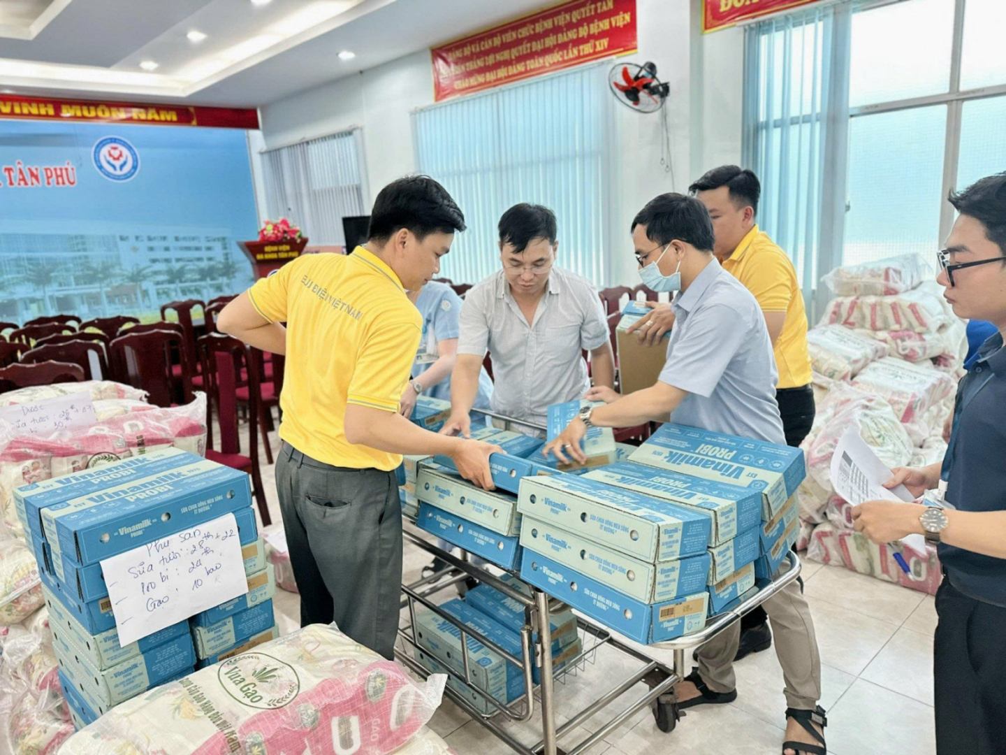 ໃນການມອບຮັບຄັ້ງນີ້, ຫ້ອງການໄປສະນີສູນກາງບິ່ງຈ່ຽງ ໄດ້ສະໜອງ 3 ລາຍການທີ່ຈຳເປັນ ໃນນັ້ນມີເຂົ້າສານ ST25 - ເປັນສິນຄ້າເຂົ້າພິເສດທີ່ໄດ້ຮັບລາງວັນ “ເຂົ້າດີທີ່ສຸດໃນໂລກ”, ຮັບປະກັນຄຸນນະພາບ ແລະ ຄວາມປອດໄພດ້ານສະບຽງອາຫານ; ເຄື່ອງດື່ມນົມສົ້ມ Probi ສົດ - ຊ່ວຍປັບປຸງສຸຂະພາບ, ສະຫນັບສະຫນູນລະບົບຍ່ອຍອາຫານ; ແລະນົມ Vinamilk - ແຫຼ່ງໂພຊະນາການທີ່ຄຸ້ນເຄີຍ, ປະກອບສ່ວນເຂົ້າໃນສຸຂະພາບຂອງພະນັກງານ, ພະນັກງານ.