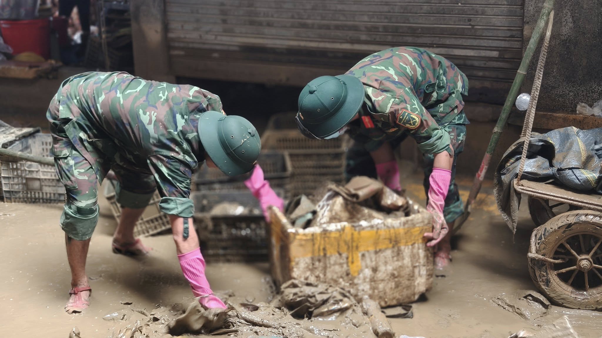 ພາບພົດຂອງທະຫານ, ພໍ່ຄ້າຊາວຂາຍ ຍ່າງໃນຂີ້ຕົມ, ເກັບຂີ້ເຫຍື້ອ, ຂົນສົ່ງສິນຄ້າເສຍຫາຍອອກຈາກເຂດຕະຫຼາດ ໄດ້ກາຍເປັນຫຼັກຖານອັນຈະແຈ້ງຂອງຈິດໃຈ ສາມັກຄີ, ແບ່ງປັນ, ນໍ້າໃຈສູ້ຊົນຜ່ານຜ່າຄວາມຫຍຸ້ງຍາກ ຂອງຊາວ ເມືອງເຫ້ວ ພາຍຫຼັງໄພພິບັດທຳມະຊາດ.
